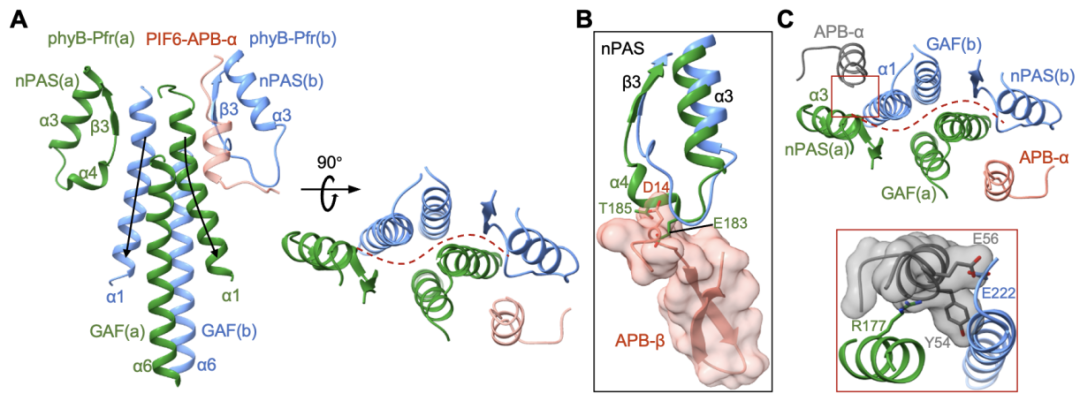 4. phyB-PfrN末端结构域对PIF-APB的特异性识别(A)以及NTE结构域特异性识别PIF-APBN末端β发夹结构(B),phyB-Pfr二聚体特异性识别PIF-APBC末端α螺旋结构(C
