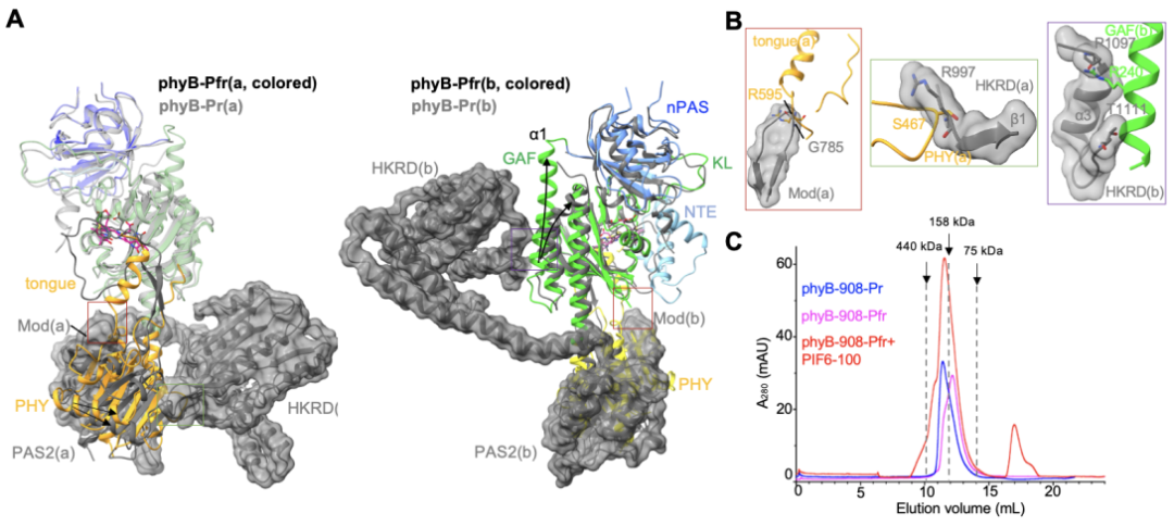 Pr状态下,phyBC末端结构域PAS2以及HKRDN末端结构域GAFPHY互作以维系头对尾二聚体构象。而在phyB-Pfr中,其PHY结构域的舌状突出结构转变为α螺旋后,会直接和Pr状态里的PAS2结构域发生空间冲突(图3A,左;图3B,左),从而破坏Pr状态下PAS2PHY结构域之间的广泛互作,这会进一步破坏HKRDPHY结构域(图3A,左;图3B,中),以及HKRDGAF结构域(图3A,右;图3B,右)之间的分子内互作,这一系列的构象变化完全打破Pr状态下的头对尾结构,最终激活phyB。此外,缺失HKRD结构域的phyB截短体蛋白(phyB-908,仅含N908个氨基酸)在光激活之后倾向于单体形式存在(图3C),进一步佐证了phyB-Pr在光激活后,原来由N端和C端模块互作维系的头对尾二聚体被打破,进而形成phyB-Pfr