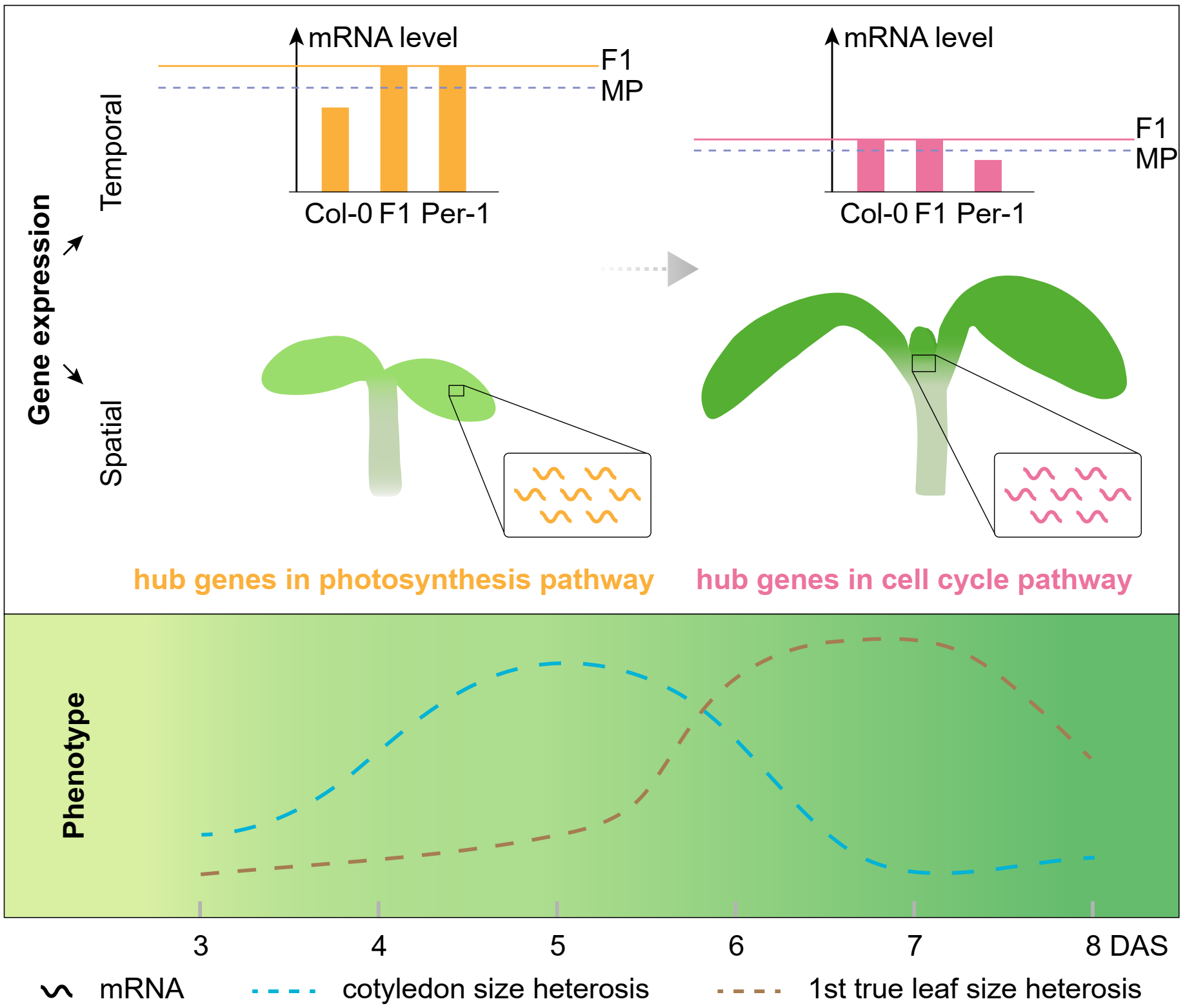 植物杂种优势往往最明显地表现在生长或生物量上。在植物幼苗生长阶段,地上部分生物量的杂种优势主要体现在:与亲本相比,杂交F1具有更强的生长势,生长速率更快,在相同时间内能够积累更多的生物量。课题组前期对200个拟南芥杂交组合的杂种优势进行了评测,其中Col-0 × Per-1杂交F1表现出最强的生物量杂种优势(Yang et al., 2017, PNAS)。为了深入解析该杂交组合杂种优势形成的分子机制,本研究对该杂交组合的杂交F1及其亲本进行了幼苗发育过程中高分辨率时序动态生长表型及转录组图谱的测定和整合分析。通过加权基因共表达网络分析(WGCNA)发现,虽然亲本和F1之间基因调控网络总体相对保守,但核心调控网络却表现出明显差异。值得注意的是,网络核心基因所富集到的两个生物学通路(细胞周期和光合作用)在两个亲本之间呈现相反的表达模式,即细胞周期通路的核心基因在一个亲本Col-0中表达水平较高,而光合作用通路的核心基因则在另一个亲本Per-1中表达水平较高。令人感兴趣的是,在幼苗发育过程中,这两个通路的核心基因在杂交F1中表现为时空上显性互补的高亲表达模式。该结果暗示,杂交子一代可通过整合两个亲本分别在细胞分裂和光合作用这两个对植物生长发育至关重要的生物学通路活力上的优势从而获得强于两个亲本的生长优势。该发现对农作物杂交育种具有指导性意义。