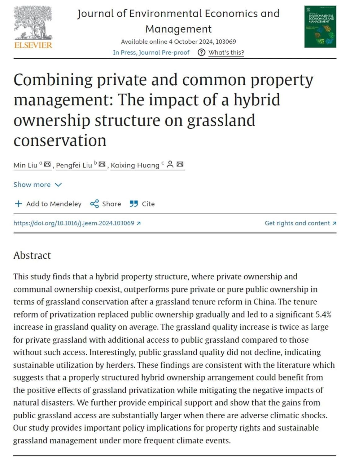 近日,黄开兴研究员以通讯作者身份与合作者在环境经济学顶级期刊Journal of Environment Economics and Management上发表文章。合作者为兰州大学的刘敏教授和罗德岛大学的刘鹏飞副教授。研究发现,在草地使用权改革后,私有产权(本文同“使用权”)和公共所有权共存的混合产权结构在草地保护方面表现优于单纯的私有或公有产权。中国的草地私有化改革逐步取代了公有制,并导致草地质量平均提高了5.4%。相比那些没有获得公共草地使用权的私有草地,拥有额外公共草地使用权的私有草地质量提升幅度是其两倍。另外,公共草地的质量并没有下降。另外,研究还发现,适当结构的混合所有权安排可以在利用草地私有化的积极影响的同时,减轻自然灾害的负面影响。研究结果为草地产权和在频繁的气候灾害下实现可持续草地管理提供了重要的政策启示。