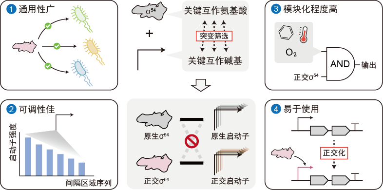 σ54因子是细菌RNA聚合酶(RNAP)中的一个可解离亚基,在RNAP全酶中负责与启动子的特异性识别与结合。通过对σ54-启动子复合体结构的分析,推测σ54的R455和R456两个氨基酸残基可通过氢键参与启动子的−24区相互作用。利用文库vs文库筛选法,得到了一个正交的σ54因子变体σ54-R456H。正交性测试实验表明,σ54-R456H仅可特异性识别与之适配的正交启动子,而失去了识别宿主自身启动子的能力。结合饱和突变、文库筛选等方法,后续发现σ54-R456H,R456Y和R456L可在细胞内同时使用,构成一组互相正交的σ因子组。考虑到σ54的R456位点在不同细菌类群中的保守性,将相同突变体导入3种非模式细菌底盘中后,均能够在其中实现正交转录,表明这套正交转录系统可在遗传背景各异的诸多细菌中发挥功能。进一步将不同类型的上游激活蛋白(bacterial Enhancer Binding Protein,bEBP)载入该系统,可实现对环境信号(如温度)或化学信号(如氧气浓度)的响应,实现依赖于特定信号的下游正交转录输出。上述结果表明,该正交转录系统本身是高度模块化的,在非模式细菌中均能发挥理想的效果;且其内部也是模块化的,bEBP可自由调整以实现更智能的自动调控。研究进一步测试了该系统用于定制正交的复杂生物学功能的潜力。选取蔗糖代谢途径、生物固氮、逻辑门等作为应用场景,使用σ54-R456H适配的正交启动子控制相应基因的转录,发现仅可在该正交σ54因子存在时,下游的基因才可开始转录,产生预期的生物学表型。这些实验表明,使用该系统可以方便地对基因线路进行正交化改造,即便对于6操纵子18基因的极复杂的生物固氮基因簇,该系统也可完全可以胜任。