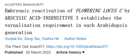 2022年3月2日,何跃辉教授课题组在The Plant Cell 发表了题为 “Embryonic reactivation of FLOWERING LOCUS C by ABSCISIC ACID INSENSITIVE 3 establishes vernalization requirement in each Arabidopsis generation” 的研究论文,报道了ABA响应转录因子ABI3在胚胎发育及成熟过程中重新激活抑制成花转变的FLC基因表达的分子机制。