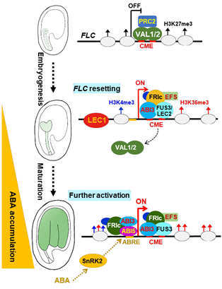最新发表的这项研究发现,在胚发育后期,B3结构域转录因子ABI3识别CME序列,并招募支架蛋白FRIGIDA (FRI)与激活性染色质修饰因子组成的超级复合体(FRIc),在FLC染色质上建立激活性的组蛋白修饰标记,从而重置FLC染色质的沉默状态。进一步研究表明,在随后的胚胎成熟过程中,ABA激素在种子中逐渐积累,ABI3与另一ABA通路的转录因子ABI5协同结合FLC启动子区的ABA响应DNA元件ABRE (ABA-Responsive Element),进一步激活FLC的表达。种子中的FLC高表达对于种子萌发以及后期的开花时间具有重要的影响。