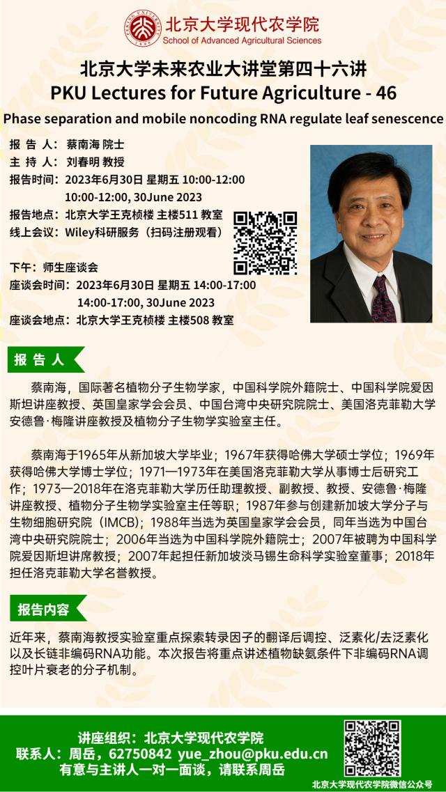 讲座通知:william威廉中文官网未来农业大讲堂第四十六讲——Phase separation and mobile noncoding RNA regulate leaf senescence