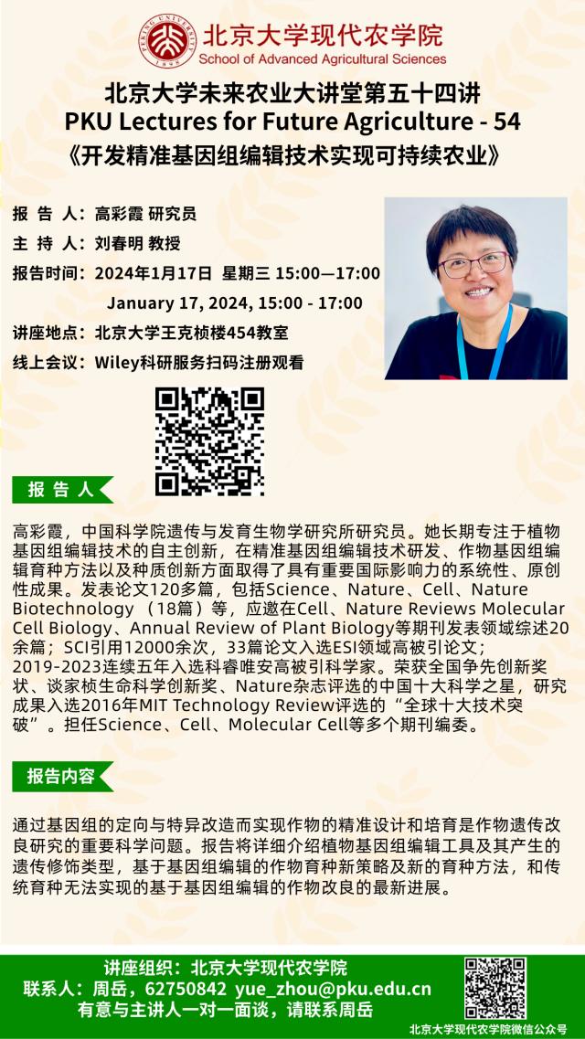讲座通知:william威廉中文官网未来农业大讲堂第五十四讲——开发精准基因组编辑技术实现可持续农业