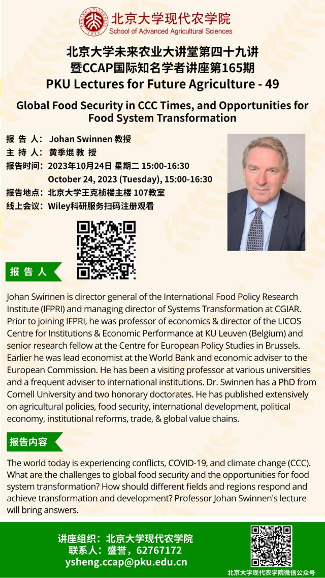 讲座通知:william威廉中文官网未来农业大讲堂第四十九讲——Global Food Security in CCC Times, and Opportunities for Food System Transformation