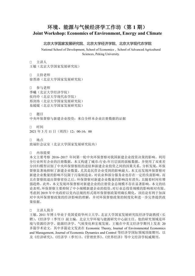 环境、能源与气候经济学工作坊第二期暨CCAP农经前沿讲座系列第97期