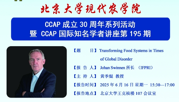 CCAP成立30周年系列活动丨国际食物政策研究所(IFPRI)所长Johan Swinnen学术报告报告时间 :2025年6月16日 星期一 15:30-17:00