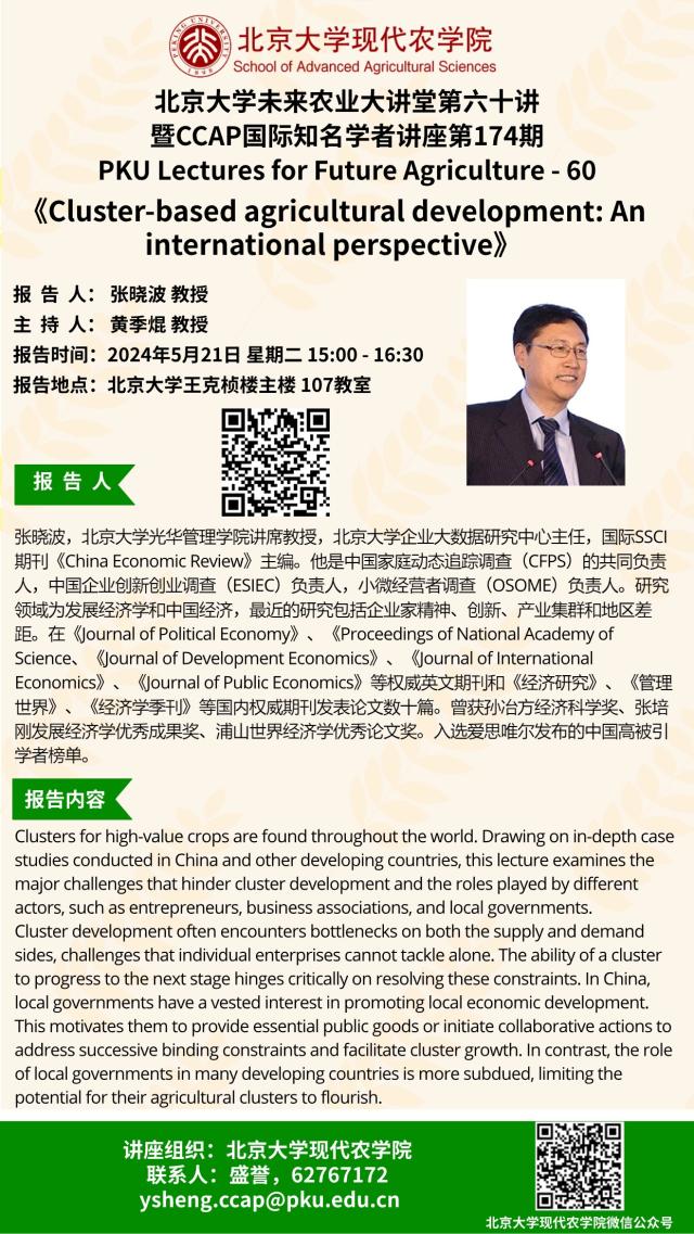 讲座通知:william威廉中文官网未来农业大讲堂第六十讲——Cluster-based agricultural development: Aninternationalperspective