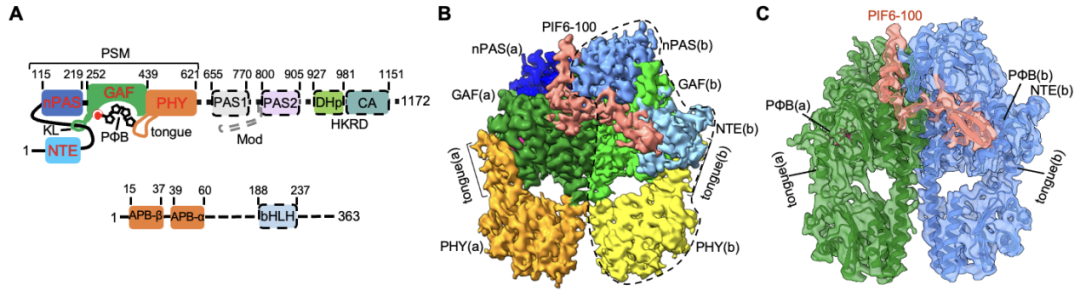 Figure 1 The asymmetric trimeric structures of phyB-Pfr-PIF6 (B) and phyBY276H-PIF6 (C).