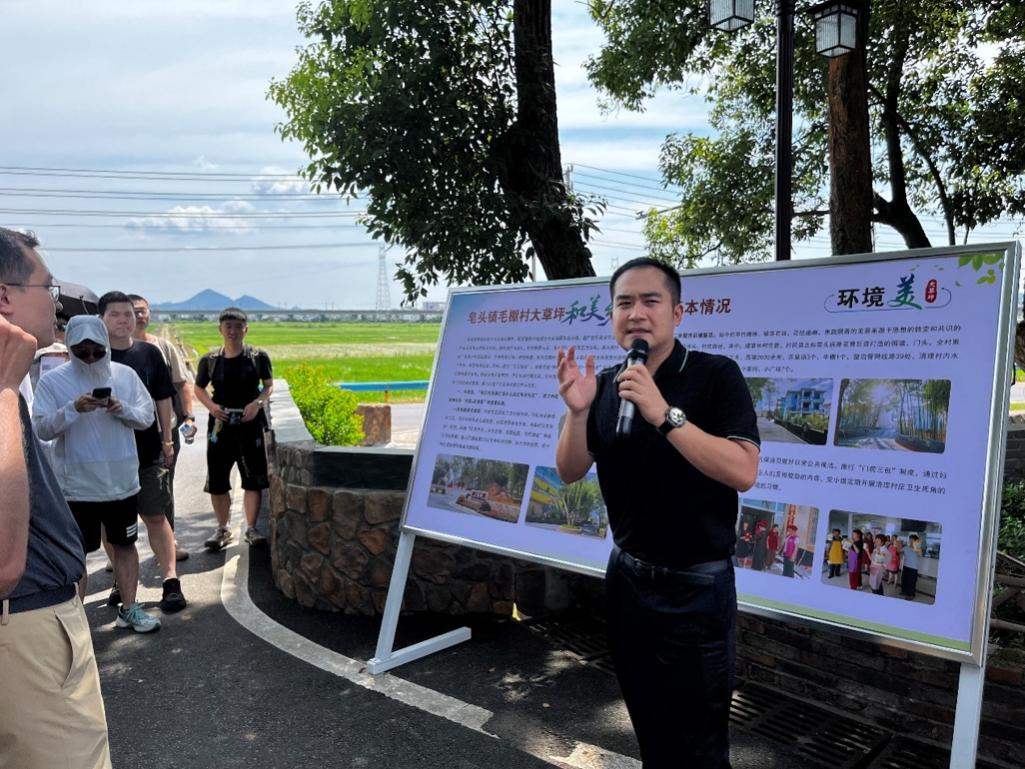此后实践团前往皂头镇毛棚村大草坪调研乡村振兴与村庄环境整治情况。大草坪自然村位于皂头镇毛棚村,毗邻云谷田园生态小镇,是广信区南乡片乡村振兴农业产业示范带上的重点村落。实践团师生与工作人员深入探讨美丽乡村建设路径,了解当地因地制宜、坚持自治、法治、德治“三治结合”,完善党建+网格+“党旗下的一约三会”的工作机制健全网格服务体系等治理举措,见证村民主动参与村庄建设管理的美丽乡村示范点建设成效,深入了解整合乡村资源、农业科技、农业经济、农业产业体系促进地方发展的生动实践,深切感受乡村振兴带来翻天覆地的变化。