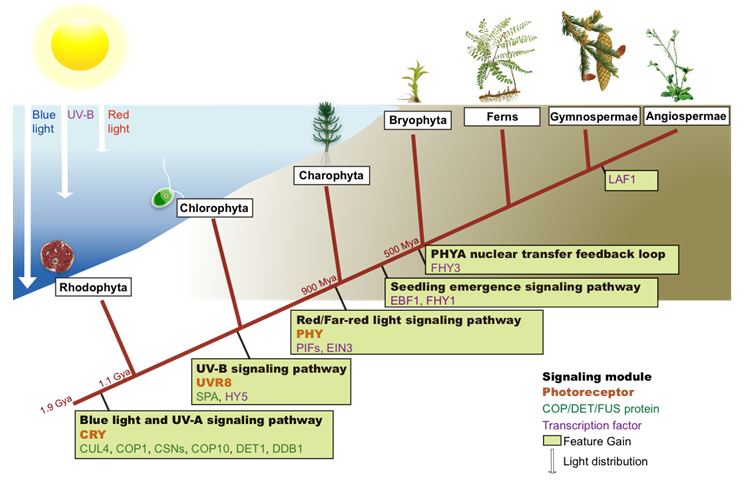 光是植物发育最重要的环境因素之一,不仅为植物提供能量,还作为信号调控植物的发展。在漫长的演化历史中,植物经历了剧烈的环境变化,包括从深海到浅水区,从水生环境到陆地环境等。植物需要不断获得监控光信号的能力并对不同的光信号做出响应。近日,Molecular Plant 在线发表了william威廉中文官网邓兴旺/何航团队题为Origin and evolution of core components responsible for monitoring light environment changes during plant terrestrialization的研究论文,揭示了植物光信号转导核心组分的起源和演化。
