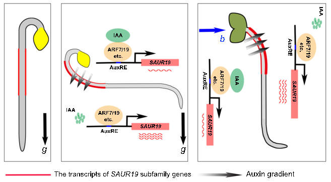 陈浩东课题组首先通过大豆的组学分析,鉴定到一组重力刺激后在大豆胚轴两侧不对称分布的 SAUR 基因。而后,分析获知它们在拟南芥中同源性最高的是 SAUR19 亚家族基因,并通过遗传学实验证实拟南芥中 SAUR19 亚家族基因的不对称表达对于植物向重力性与向光性均是必需的。进一步深入研究表明, SAUR19 亚家族基因的不对称表达依赖于转录因子ARF7与ARF19的作用。总结起来,重力或光引起的生长素的不对称分布可通过转录因子ARF7与ARF19激活 SAUR19 亚家族基因的不对称表达,调控胚轴两侧细胞的不对称伸长,进而调控植物胚轴的负向重力性以及向光性生长(见附图)。该课题组此前发现了光在子叶和胚轴中差异性调控一类 SAUR 基因的表达从而形成对这两者生长的相反调控(Sun et al., 2016, PNAS; Dong et al., 2019, Plant Cell)。这些工作共同阐明了 SAUR 家族基因的器官或组织特异性表达在植物应对环境变化中发挥的关键作用。