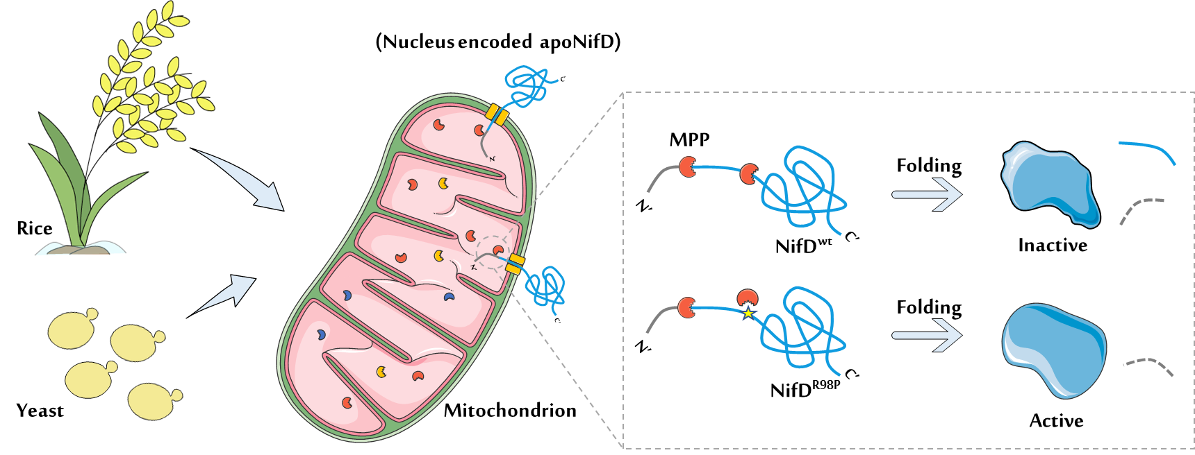 配图:固氮酶核心酶组分NifD蛋白及其稳定突变体在酵母及植物线粒体中定位表达示意图。野生型NifD(NifDwt)蛋白中由于存在一个天然的疑似内在线粒体信号肽酶(Mitochondrial-Processing Peptidase, MPP)切割位点,而被错误切割,从而导致其无法正确折叠;而NifD-R98P(NifDR98P)等突变体通过对NifD蛋白天然切割位点的突变限制了MPP酶的切割,从而保证了NifD蛋白的正确折叠。