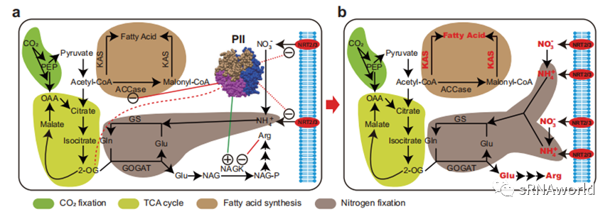 通过基因组和转录组数据综合比较,发现菊科植物中调控碳氮平衡的关键基因PII发生了丢失。PII是一种位于叶绿体的氮传感器,可激活N-乙酰基-L-谷氨酸激酶以促进氮同化。PII还与乙酰辅酶A羧化酶的生物素羧基载体蛋白亚基形成复合物,以抑制乙酰辅酶A羧化酶活性。此外,PII可能参与氮吸收的负调节并防止陆地植物过量吸收亚硝酸盐。通过莴苣中异源表达PII等一系列试验,发现PII丢失对菊科植物碳氮平衡的进化起到了重要作用。结合菊科植物中低氮条件下同化氮的基因和脂肪酸合成基因家族扩增的现象,表明菊科植物对碳氮代谢进行了重构(图2)。
