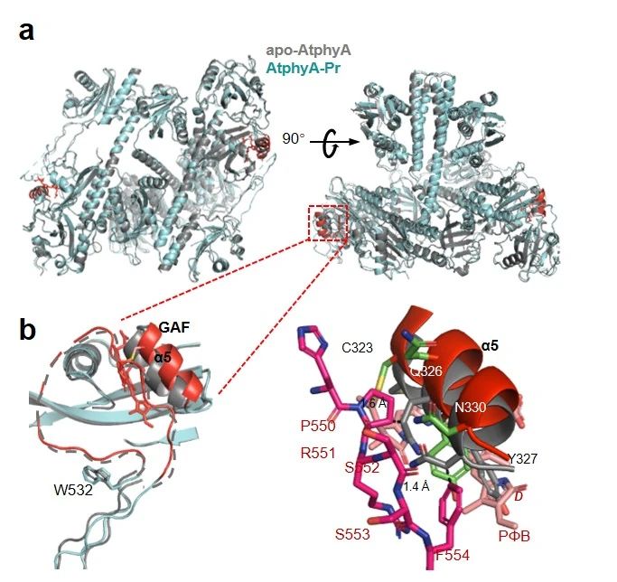 图1. 拟南芥apo和Pr形式的phyA结构比较(a)和差异细节(b),揭示发色团PΦB组装到phy蛋白的分子机制。