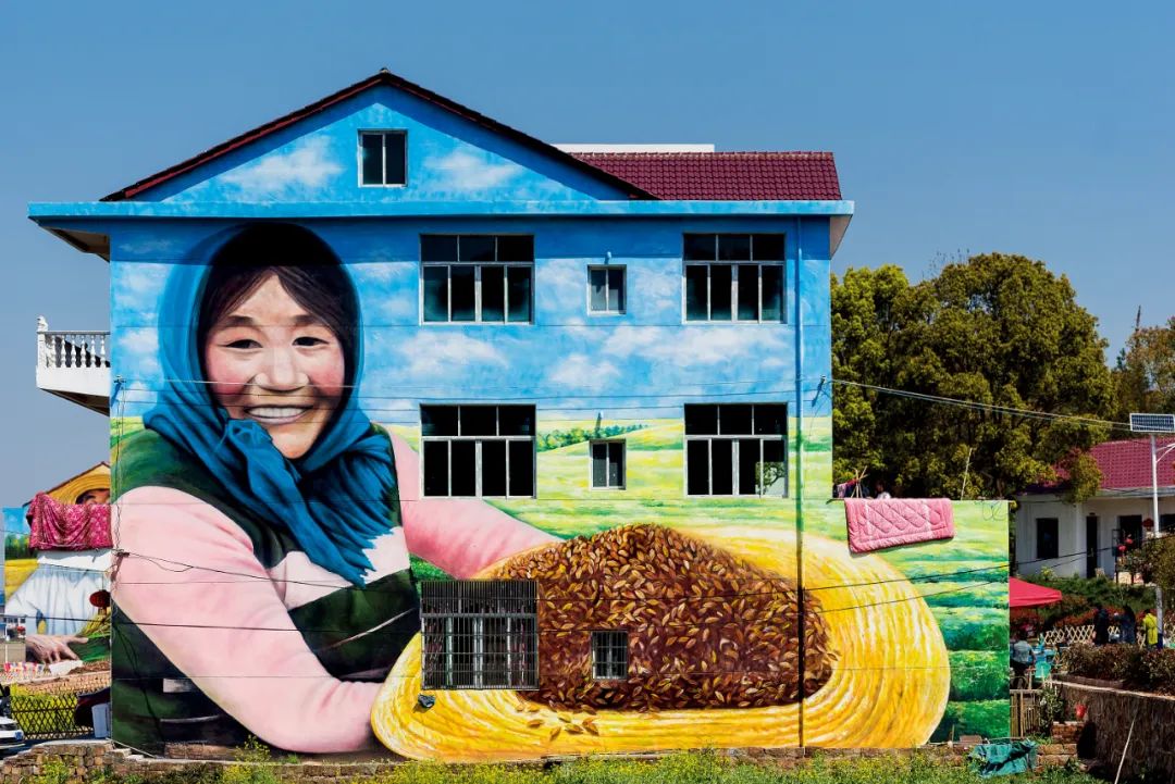 江西上饶市广信区皂头镇,三联村一幢房屋外妇人手捧种子的壁画。图/视觉中国