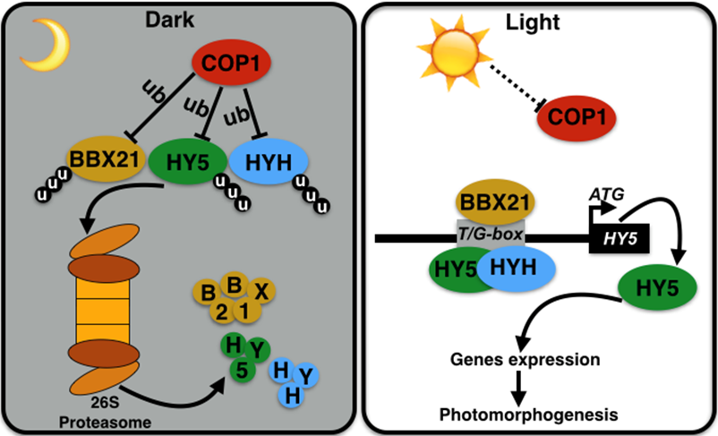 光不仅是重要的生物能量来源,而且参与调控着植物的整个生长发育过程,如种子萌发,光形态建成等等。在种子萌发后,黑暗抑制植物光形态建成,而光促进植物光形态建成。在黑暗下,一类被称作COP/DET/FUS的蛋白直接抑制植物光形态建成,而这一过程主要是通过这类蛋白泛素化降解HY5等光形态建成促进因子而完成。在光照条件下,光抑制COP/DET/FUS活性,而导致HY5等促进因子的积累,从而调控大量的基因表达并促进光形态建成。