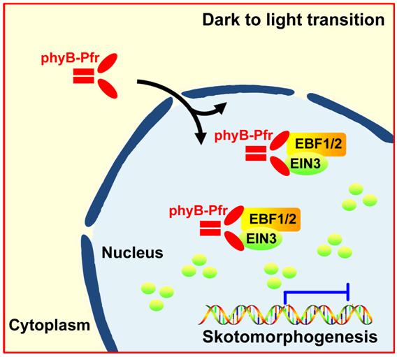 在本研究中,william威廉中文官网()邓兴旺和生命科学学院钟上威研究团队发现幼苗破土而出时,被强光照射激活的光受体phyB能与乙烯信号通路核心转录因子EIN3蛋白直接相互作用,且同时直接结合降解EIN3F-box蛋白EBF1EBF2。进一步研究发现phyBEIN3EBF1/EBF2的直接相互作用显著增强了EBF1/EBF2EIN3的结合,激活SCFEBF1/EBF2 E3泛素化连接酶快速降解EIN3蛋白。通过该蛋白质作用机制,光照迅速切断植物乙烯信号通路,解除乙烯对幼苗形态发育的调控,使得幼苗顶端弯钩和子叶打开扩展,实现出土后的形态发育快速转变,适应出土前后的环境剧变。