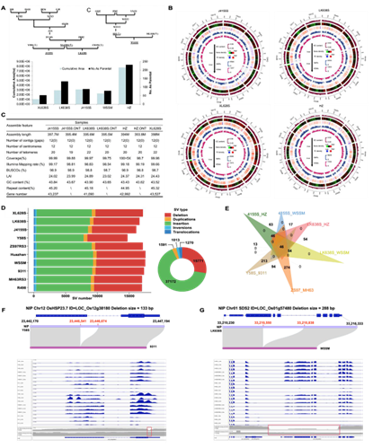 基于对以上四个杂交水稻骨干亲本以及已发表的珍汕97(ZS97)、明恢63(MH63)、蜀恢498(R498)、五山丝苗(WSSM)、Y58S、9311的基因组,与日本晴(MSU)进行基因组比对,鉴定出不同水稻亲本之间的结构变异。在日本晴和10个籼稻基因组之间鉴定出422,858-526,481个INDEL和56,817个非冗余的SV,包括52,943个PAV(图1D)。在10个籼稻基因组中,共有2182个功能基因受到PAV的影响,其中565个为籼粳稻之间PAV,包括OsLBD37,SaM,OsMFT1,OsF3H,其余为籼稻内部PAV基因,而其中70个为某一籼稻基因组特有PAV基因,这部分基因可能是该杂交组合表现优异的重要原因。