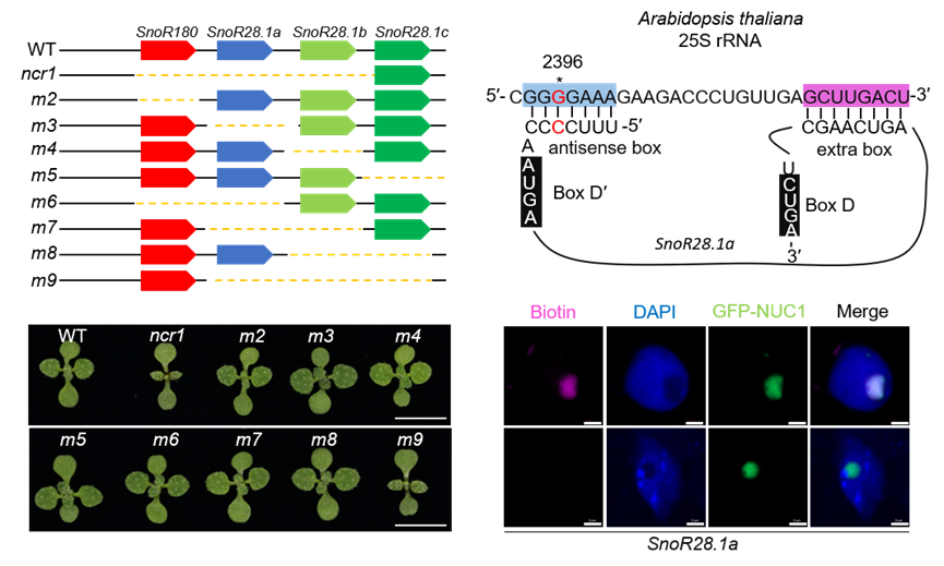 研究人员通过筛选CRISPR/Cas9系统构建的非编码RNA缺失突变文库,鉴定到box C/D SnoR28.1 cluster是植物生长发育的重要调控因子。SnoR28.1s的缺失会导致拟南芥真叶和根的生长出现缺陷(图一)。SnoR28.1 cluster为典型的C/D类snoRNA簇,定位于核仁。利用RiboMeth-seq对SnoR28.1s缺失突变体核糖体RNA甲基化水平检测,发现在25S rRNA的2396位2'-O-甲基化水平较野生型降低,并通过低脱氧核苷酸浓度的逆转录PCR(RTL-PCR)和Primer extension analysis实验证明与上述结果一致,说明SnoR28.1s可催化25S rRNA G2396上的2'-O-甲基化修饰。RNA gel blot实验发现45S rDNA的转录水平在SnoR28.1s缺失突变体中有明显积累,且突变体中异常加工产物27SB rRNA (27SB*)明显积累。27SB是25S rRNA和5.8S rRNA的前体,对于60S大亚基的组装有重要作用,研究者进一步通过Ribosome profile和抗生素处理实验证明,突变体rRNA的加工缺陷影响了核糖体的正常功能。SnoR28包含一个7-bp的反义盒 (antisense box) 和一个8-bp的"extra box","extra box"可与rRNA甲基化位点附近序列互补。研究人员利用antisense box和"extra box"不同突变转基因材料经实验证明antisense box是25S rRNA甲基化和rRNA前体加工所必需的,"extra box"是rRNA前体加工所必需的,同时也部分负责甲基化功能。该研究结果为植物中snoRNA集群的生物学作用提供了新的见解。