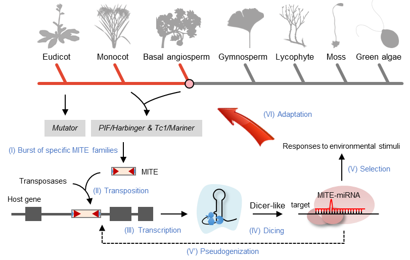 MiRNA是动植物中广泛存在的一类单链核酸调控因子。过去20年中对植物miRNA合成的生化过程及miRNA的功能均已进行了深入研究,但miRNA从头起源的遗传机制还悬而未决。研究人员利用前期构建的植物miRNA数据库(https://pmiren.com/),对21种代表性植物中的miRNA位点进行了详细分析,系统鉴定了由靶基因反向重复、LTR转座子和MITE等3种模型所产生的miRNA,发现被子植物中的miRNA主要来源于MITE。通过综合分析基因组和转录组数据,提出了位于内含子中的中等长度的MITE随宿主基因一同转录后形成的发夹结构,被以Dicer-like蛋白为核心的剪切复合体识别后形成新miRNA的模型。进一步发现双子叶植物中Mutator、单子叶植物中PIF/Harbinger和Tc1/Mariner超家族MITE的爆发,是被子植物中miRNA剧增的主要原因(图一)。最后,通过分析miRNA靶基因的功能和表达模式,发现由MITE起源的miRNA优先调控与环境胁迫及适应相关的基因。这些发现阐明了被子植物miRNA经非自主微型转座子从头产生的遗传机制,揭示了新形成的miRNA由于提高植物的环境适应性而得到选择的可能性。