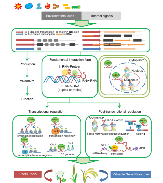 非编码RNA(non-coding RNAs, ncRNAs)指不编码为蛋白质,直接以RNA形式发挥生物学功能的核糖核酸总称。近年来已有大量研究发现,长度大于50个核苷酸的ncRNA在植物生长发育与环境信号响应中发挥重要作用。它们是基因表达调控的关键因子。