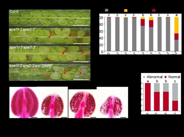 进一步的遗传学实验发现,拟南芥APE的三重敲除突变体是胚胎致死的,而各自的单突变没有发育异常,表明APE功能的重要性和冗余性。两两间的双突变中,只有ape1l ape2双突变表现出发育缺陷,包括营养生长和生殖生长的缺陷。通过测试这一系列的单、双突变体对多种DNA损伤试剂的敏感性,发现ARP是主要的AP位点修复酶,而APE1L和APE2偏好于修复SSB上的3'-残基。这些酶活上的分化可能可以解释为什么ARP与APE1l或APE2的双重突变没有发育异常,而只有APE1l与APE2的双突变表现出发育缺陷。