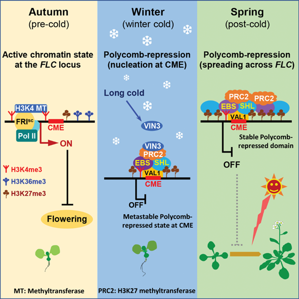 染色质修饰与重塑对于真核生物基因表达起着重要的调控作用。“春化作用”,即植物的“越冬记忆”,是植物中经典的染色质修饰介导环境信号响应的表观遗传调控范例。在十字花科模式植物越冬拟南芥的春化过程中,长期持续低温(寒冬)沉默成花转变的抑制基因FLC的表达,春季升温后,这种沉默状态被稳定维持,赋予植物“冬季低温的表观遗传记忆 (epigenetic memory of winter cold)”,从而使越冬拟南芥能在春季开花结实。冷处理之前,FLC位点的染色质处于高度激活状态,富含组蛋白H3第4位赖氨酸的三甲基化(H3K4me3)以及第36位赖氨酸的三甲基化(H3K36me3)等转录激活性修饰。冬季长期低温的处理诱导该位点染色质形成富含转录抑制性的H3K27me3修饰的多梳沉默域(Polycomb domain)。然而,激活状态的染色质转变为沉默状态的调控机理仍不清楚。