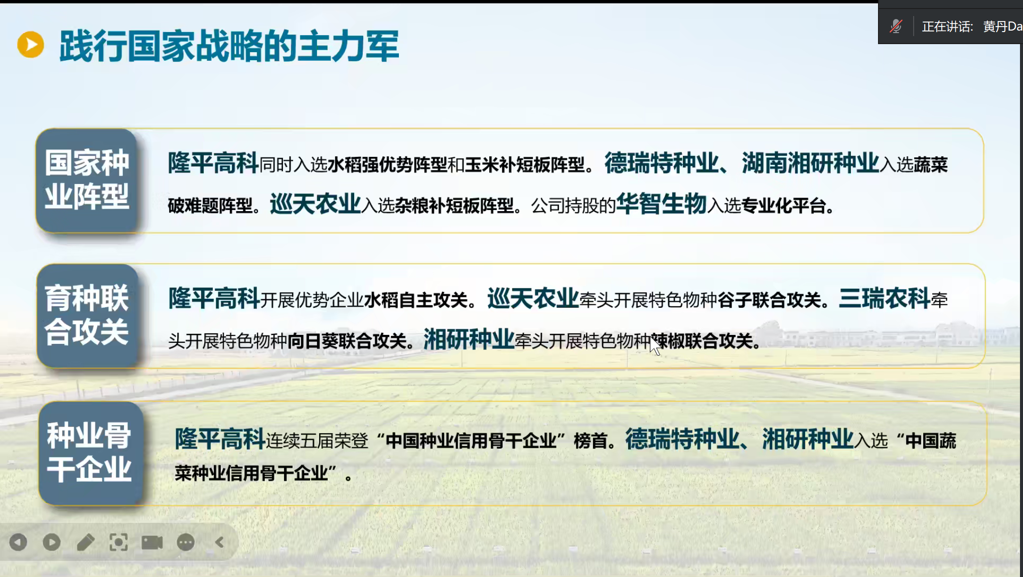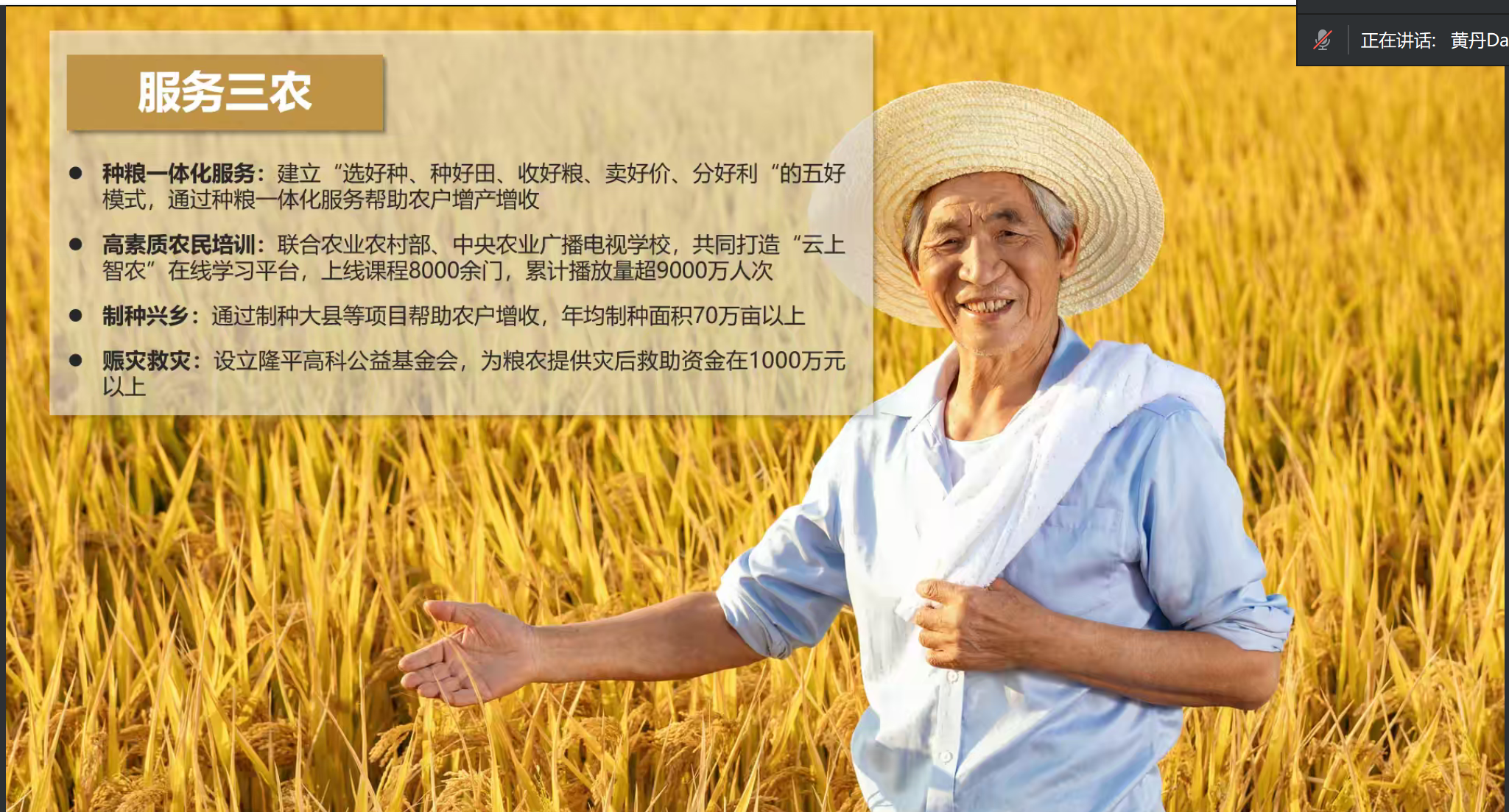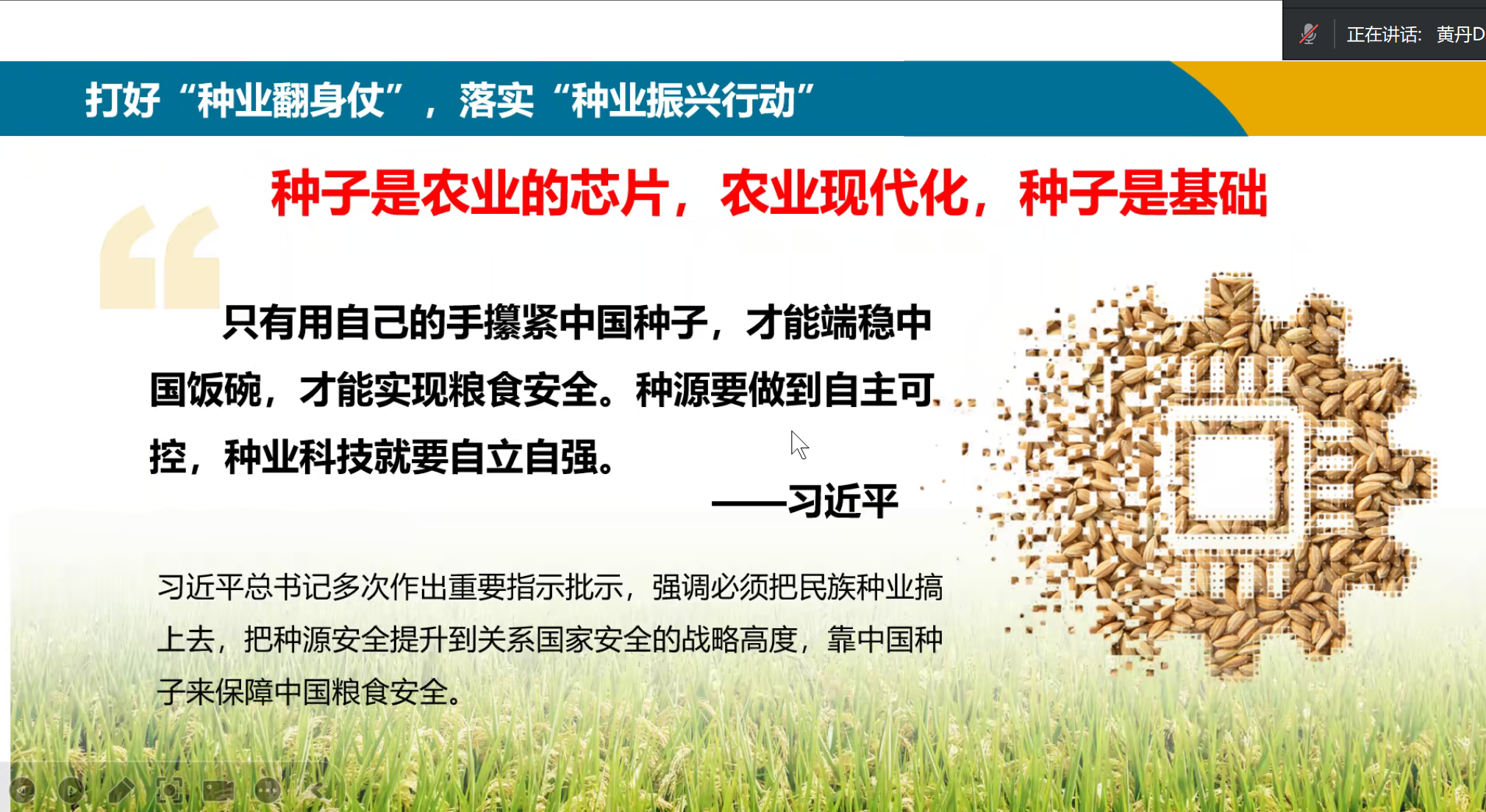 黄丹首先为员工党员介绍了隆平高科的发展情况。袁隆平院士作为公司主要发起人之一,其“禾下乘凉梦”与“杂交稻覆盖全球梦”的伟大愿景始终激励着隆平高科不断前行。作为中信集团的重要板块,隆平高科在国家种业振兴方案中扮演着重要角色,积极响应国家提出的打好种业翻身仗的号召。