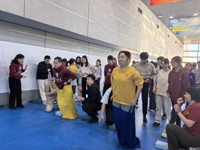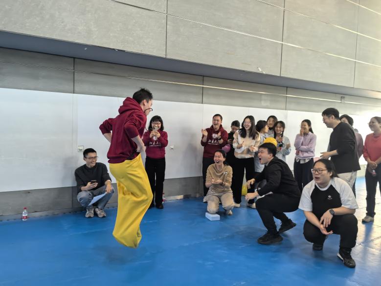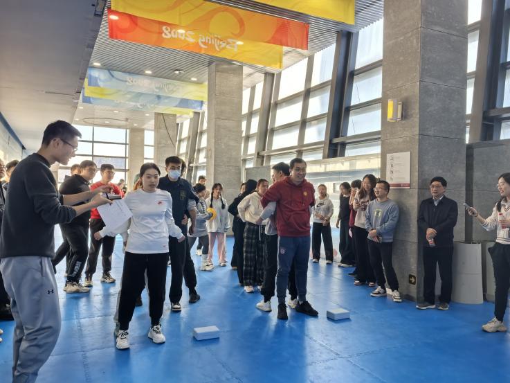 “背靠背运球” 项目则着重考验队友之间的信任与协作。两名队员背靠背将球夹在中间,同步向终点线迈进。赛场上,有的组合步伐协调一致,如同一人,快速而稳健地向终点冲刺;有的组合虽然球多次掉落,但他们始终相互鼓励,不抱怨、不放弃,坚持完成比赛。这一项目让大家深刻体会到了团队合作中信任与沟通的重要性,也让彼此之间的关系更加紧密。最终,“不知道起什么名字队”获得该项目第一名。