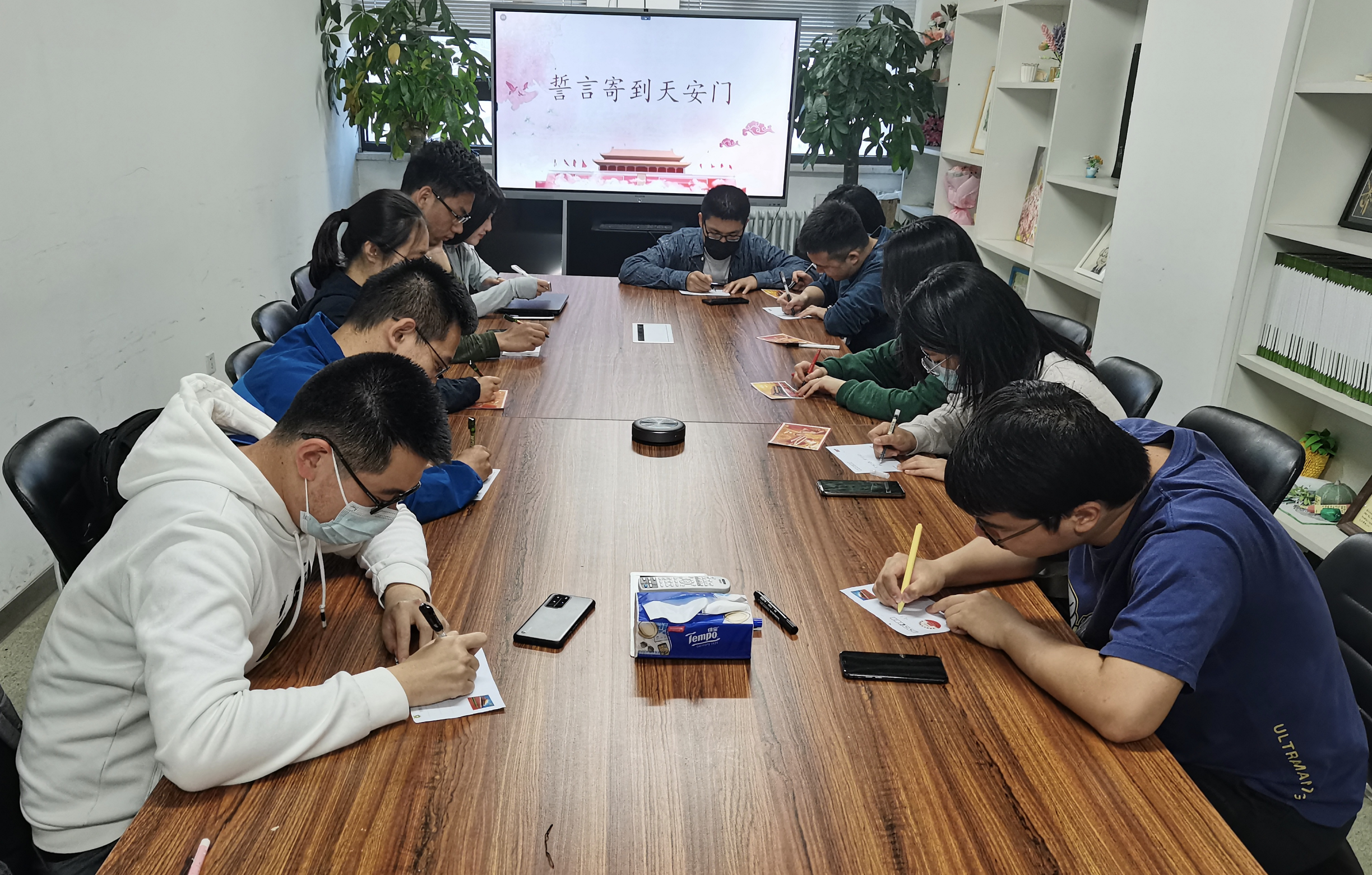 2022年4月30日,williamhill英国官网2021级研究生班级于王克桢楼413室开展“誓言寄到天安门”主题班级活动,深入学习习近平总书记在庆祝中国共产党成立100周年大会上的重要讲话精神,通过书写明信片的方式,抒发铮铮爱国誓言,传承红色基因,赓续红色血脉,深化思想引领,凝聚青年力量,传递“请党放心,强国有我”的时代强音。
