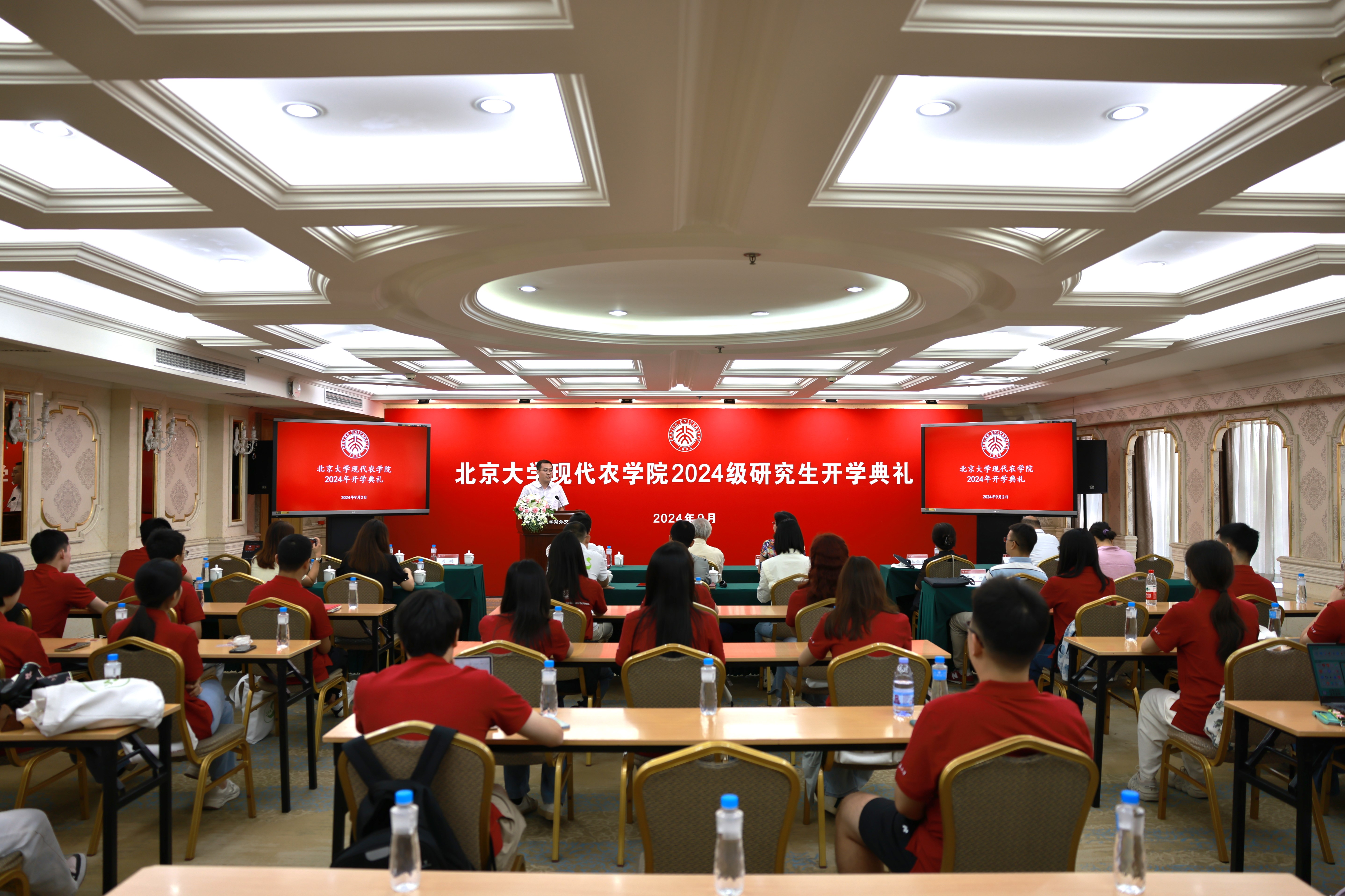 在师长和同窗的共同见证下,2024级新生集体佩戴校徽,迎接作为新北大人、农学学子的人生新阶段。戴上校徽,以新身份唱起《燕园情》,同学们用歌声表达了“情系着城镇乡野”的深刻情怀,寄托了在燕园实现梦想、奉献时代的期许。