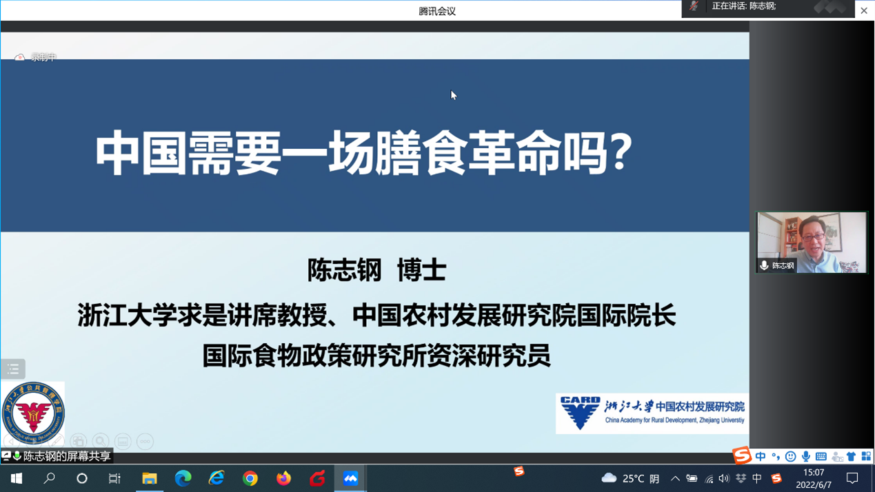 2022年6月7日下午,williamhill英国官网未来农业大讲堂暨CCAP国际知名学者讲座邀请浙江大学公共管理学院求是讲席教授、中国农村发展研究院国际经理和浙江大学-国际食物政策研究所联合国际发展研究中心主任陈志钢教授在线上做了题为“中国需要一场膳食革命吗”的报告。讲座由williamhill英国官网教授、中国农业政策研究中心名誉主任、新农村发展研究院经理黄季焜教授主持,约800人线上参会。