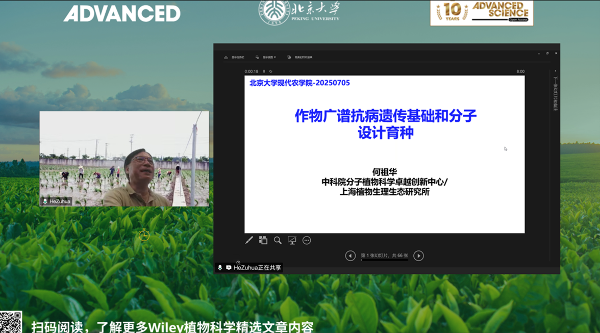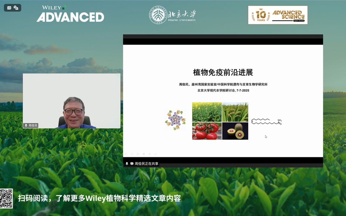 周俭民老师首先回顾了植物免疫概念的提出和探索过程,并引出从植物免疫机制到作物抗病性研究的可迁移性。周老师实验室长期从事免疫受体相关研究,尤其是NLR受体的研究。报告重点介绍了,细菌分泌的AvrAC酶可以与尿苷单磷酸(UTP)结合后,与BIK1的复合物互作,从而影响植物的PTI免疫反应。针对这一机制,植物进化出另外一种策略,PBL2模拟BIK1的形态和功能,与细菌的AvrAC酶结合后,可以与ZAR1互作,从而激活植物的ETI免疫反应。这一机制为我们理解在复杂环境和生物胁迫下,植物如何“智慧”识别病原物,以“诱饵”蛋白吸引细菌分泌物,从而激活免疫机制提供了全面的理论基础。