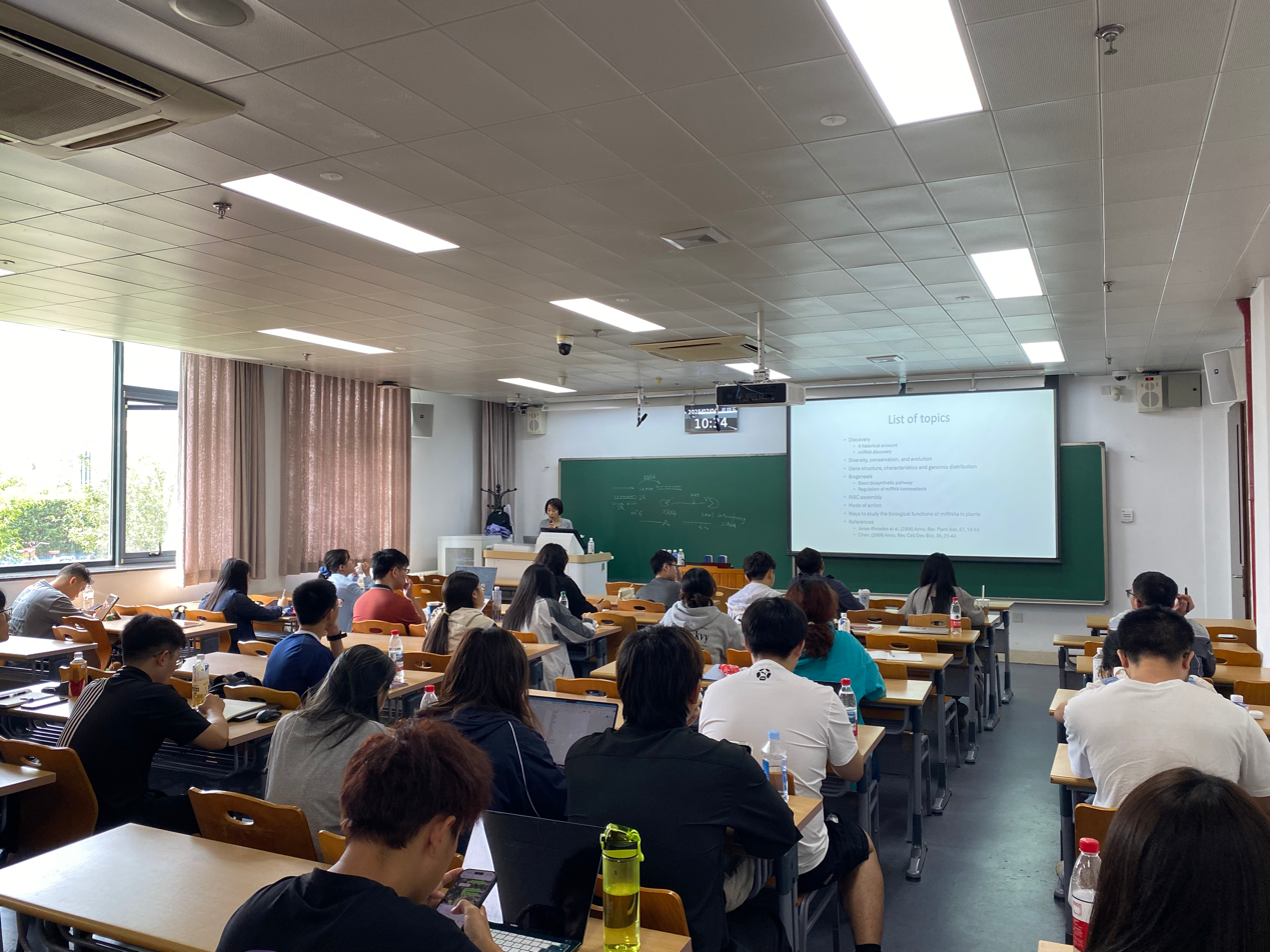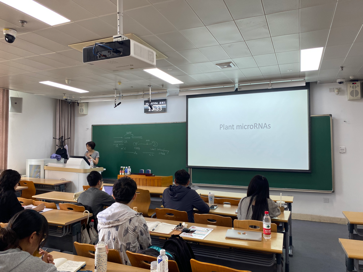第五天的课程由陈雪梅老师讲授。陈老师首先介绍了小RNA在动植物中广泛存在,并在生长发育和应对环境胁迫中发挥着重要作用。随后,陈老师讲解了PTGS机制,并进一步引出了RNAi机制,以及RNA研究在生产实际中的应用,例如RNA农药和获得诺奖的“mRNA疫苗”等。接着,陈老师系统性的介绍了在动植物中庞大的数量siRNA和miRNA的发现历程和分子机制。这些内容为我们提供了除“基因-转录-蛋白”这一传统调控路径之外,理解更为复杂的生命调控机制的新视角。除此之外,陈老师也介绍了小RNA与表观遗传机制的关系。