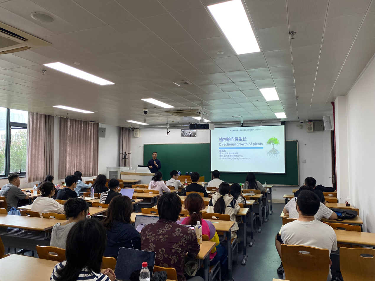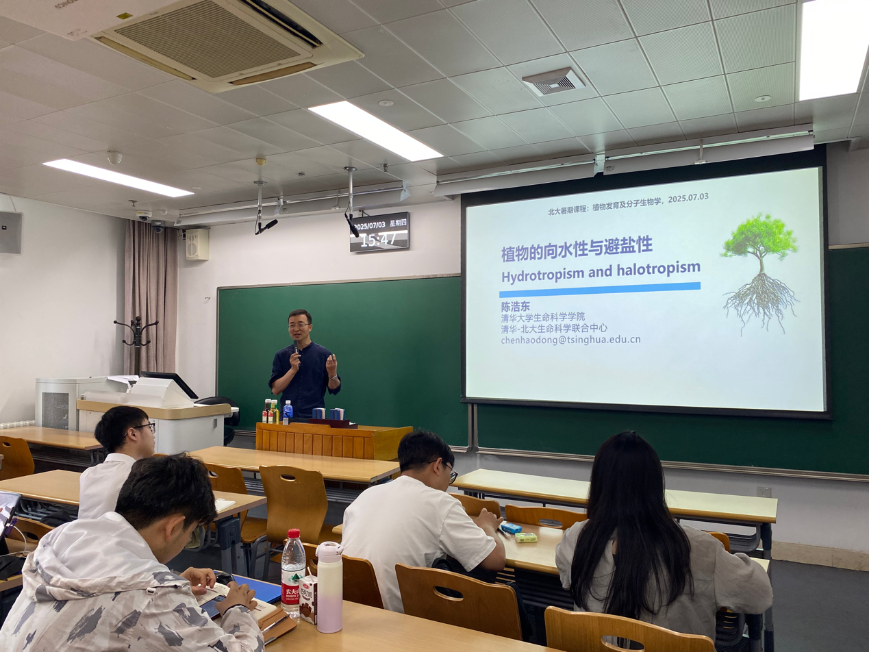 第四天课程由陈浩东老师主讲。他从自己多年的科研经历谈起,分享了在研究光信号调控植物生长发育过程中,发现特定的光环境会对植物的负向重力性生长产生影响,这个现象激发了他强烈的好奇心。独立开展工作后,他利用苔藓和拟南芥开展了植物向重力性的研究。