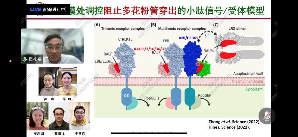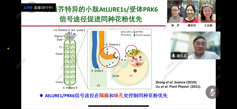 瞿礼嘉老师还讲到,在动物受精过程中,常会发生多个精子与卵子融合现象,引起胚胎细胞的基因组紊乱,导致胚胎发育终止。因此,动物中有非常严格的控制机制防止“多精受精”。而在被子植物中有大量的花粉管在花柱道中生长,因此,被子植物中防止“多精受精”的控制机制就很大程度上转变成限制多根花粉管从隔膜穿出靶向同一个胚珠。瞿老师团队首先鉴定到在雌蕊花柱道隔膜处表达的三个受体FERONIA、ANJEA和HERK1,这三个受体在膈膜处建立不让“多花粉管穿出”的“屏障”,同时瞿老师团队又鉴定到花粉管分泌的五个小肽RALF6、7、16、36和37是这三个受体的配体信号分子,也参与到该过程中,首次阐明了在花柱道隔膜处防止多花粉管穿出屏障的建立是依赖于雌-雄双方的相互作用,揭示了拟南芥中防止多花粉管受精的分子机制。