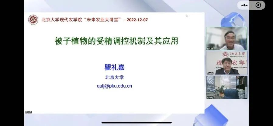 2022年12月7日(星期三)下午,williamhill英国官网未来农业大讲堂邀请william威廉中文官网蛋白质与植物基因研究国家重点实验室主任,北京老员工命科学学院瞿礼嘉教授,做了题为“植物雌雄互作调控受精的分子机理及其应用”的报告。报告由williamhill英国官网经理刘春明教授主持,来自校内外7000余名师生线上观看瞿老师的精彩报告。报告围绕花粉管的演化生物学地位、花粉管定点爆炸、花粉管导航至胚珠处受精、防止多精受精机制、启动宿存助细胞死亡、被子植物双受精的优先性六个方面展开,最后提出把雌雄配子互作的分子机制应用于农业和园艺育种的长远目标。
