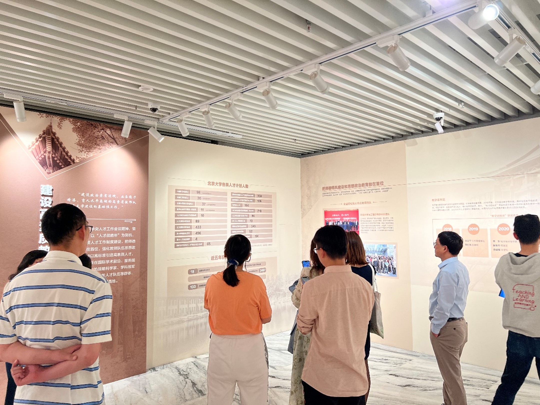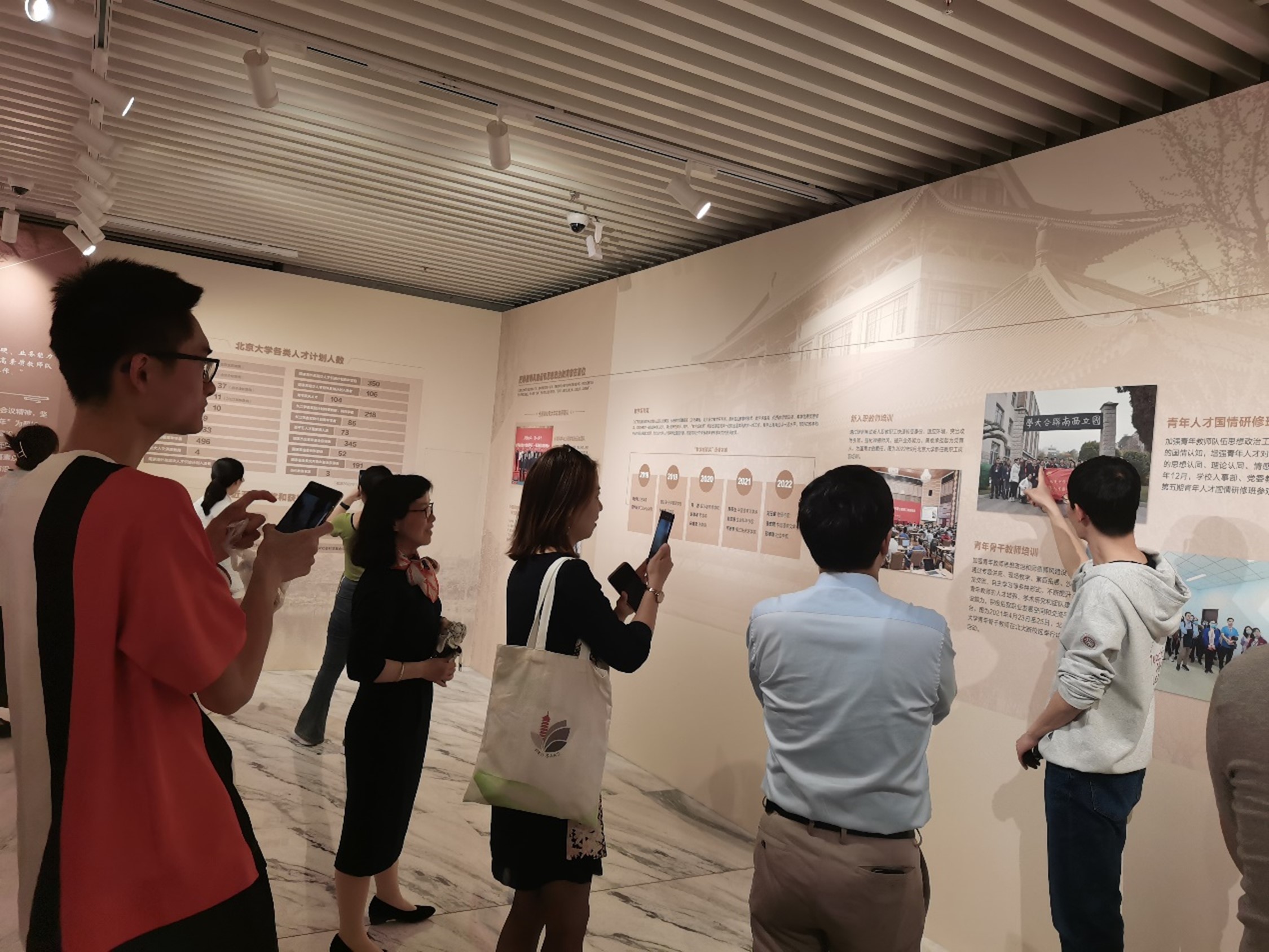 在场师生党员驻足观看、热烈讨论,重温习近平总书记“5·2”重要讲话内容;全面回顾近年来北大围绕立德树人根本任务,扎根中国大地办大学,推进“双一流”建设的举措和成果;学习“获国家重要奖项的北大人”光荣事迹,将榜样的力量转化为奋进新时代的强大动力。