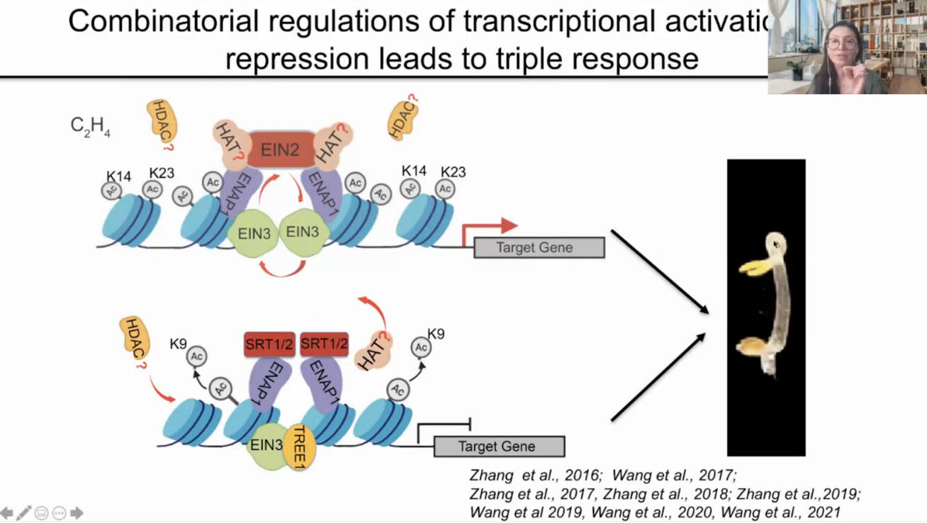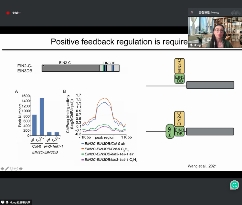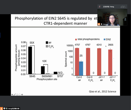 课程中,乔老师介绍了自己实验室在乙烯信号转导通路中取得的新进展。在课程中,乔老师通过线上连麦的方式与同学们互动,鼓励同学们勇敢展现自己,课堂氛围活跃,乔老师为同学们答疑解惑、同时还分享了自己科研生涯的宝贵经验。