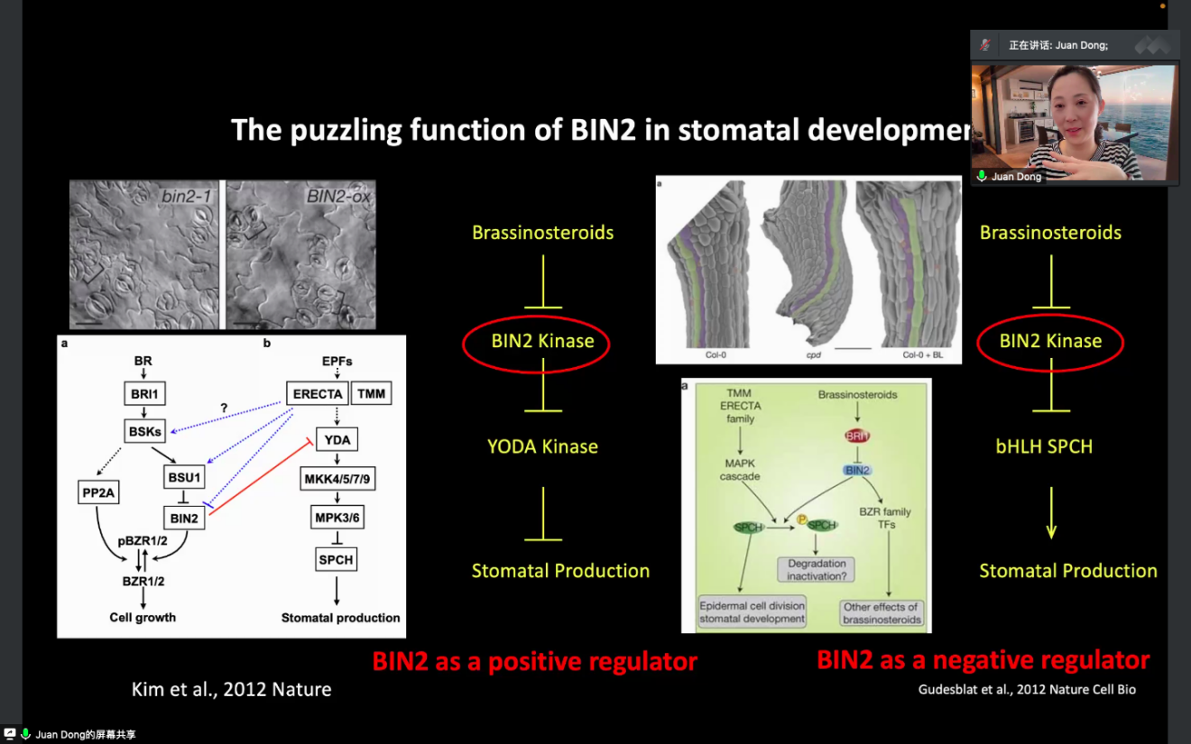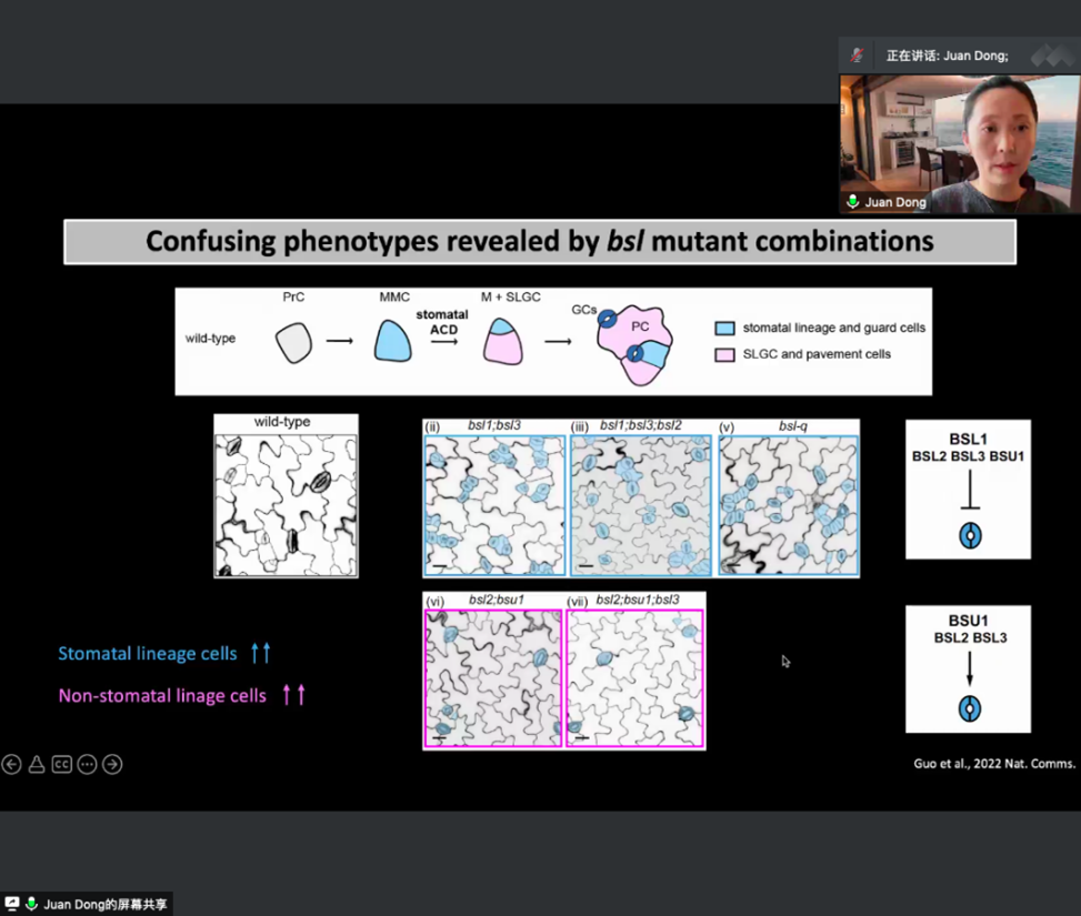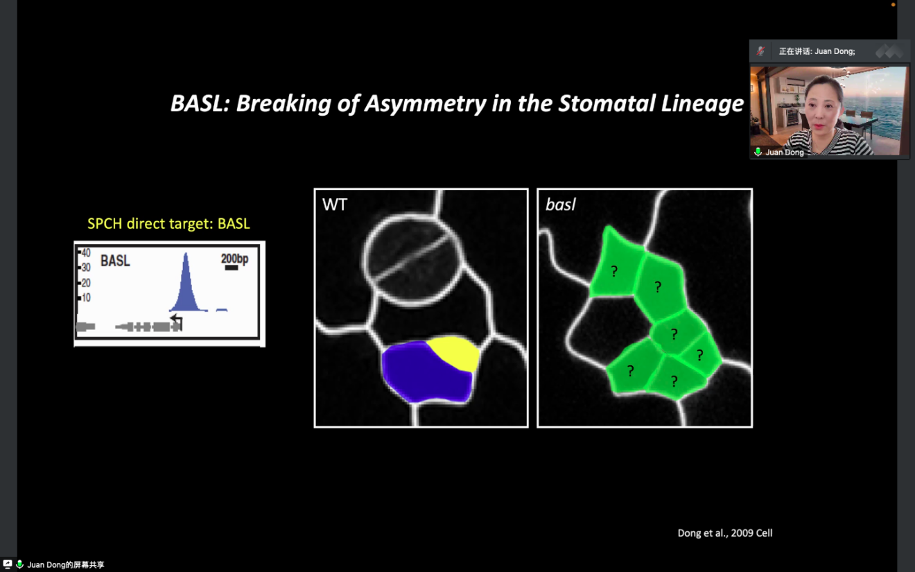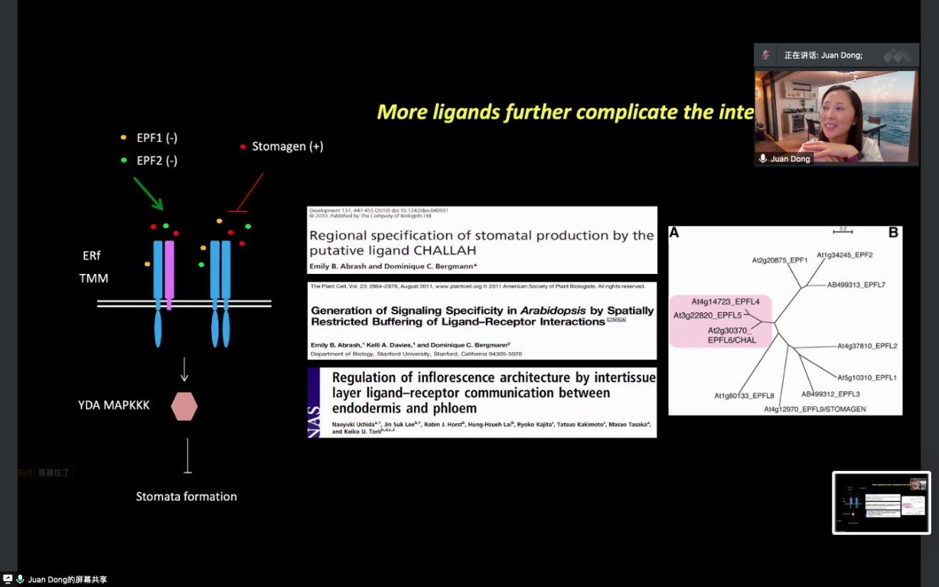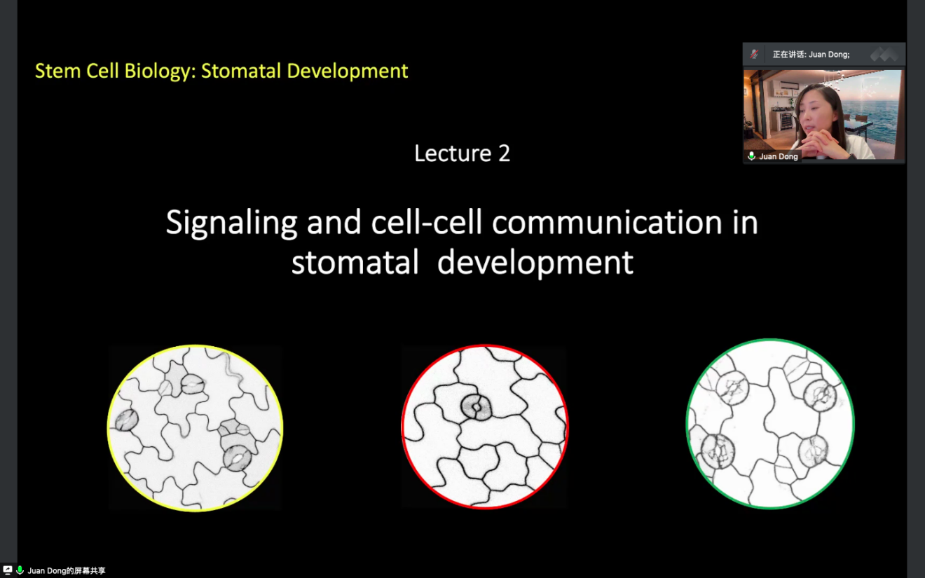 第一天的暑期课程由林辰涛老师主持,董娟老师主讲。林老师向大家简要介绍了课程的历史以及本期课程邀请的诸位老师及授课主题,之后董老师带领大家走进植物发育过程中的细胞生物学领域。上午的课程中,老师讲解了植物气孔发育的相关内容,重点讲解了气孔细胞发育进程中3个核心转录因子SPCH、MUTE和FAMA的发现过程以及作用机制, 介绍了在感知环境变化及细胞间的交流中配体与受体结合向下游传递气孔发育信号的多样性,如即使是同一个receptor,TMM,在植物不同的发育部位对气孔发育的调控也是不同。