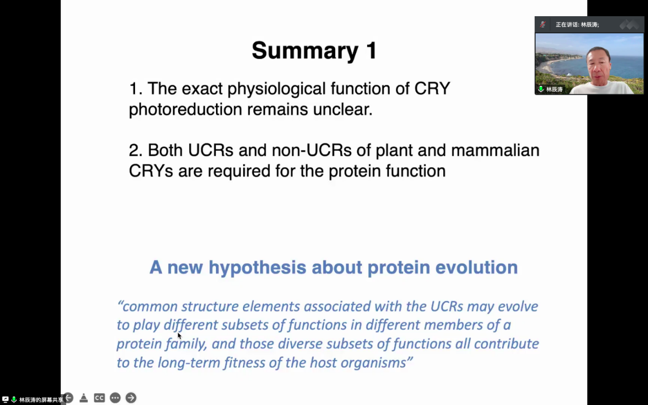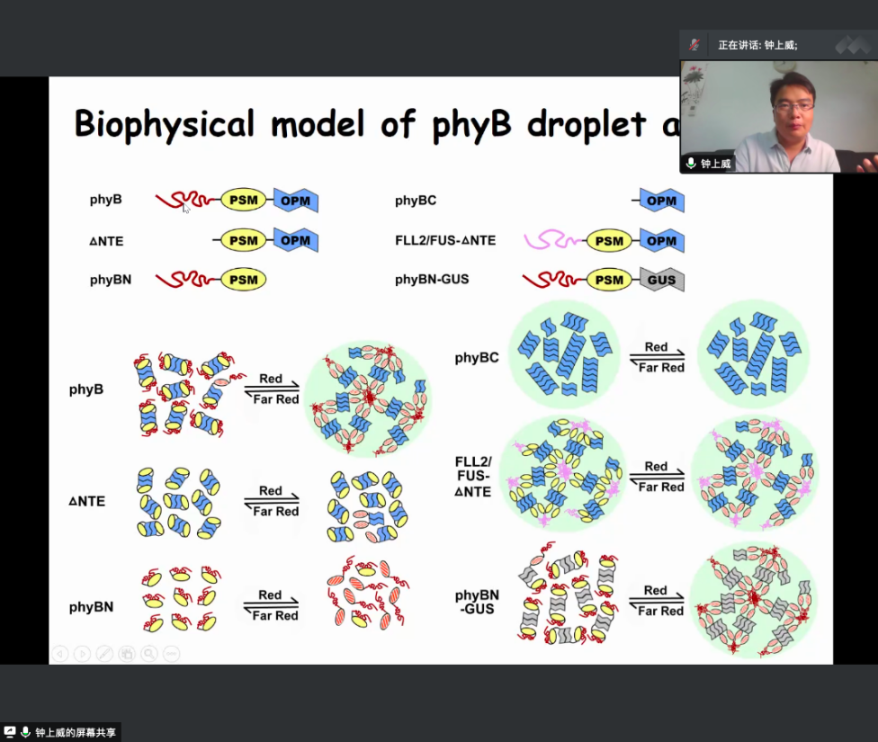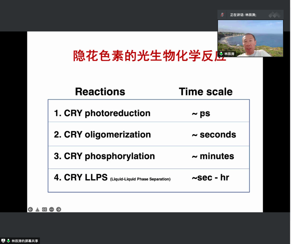 林辰涛老师从介绍植物光受体出发,回顾了蓝光受体的发现过程及其在动植物中的不同功能,系统地讲解了隐花色素的光还原反应、聚合反应、磷酸化反应和相变反应。