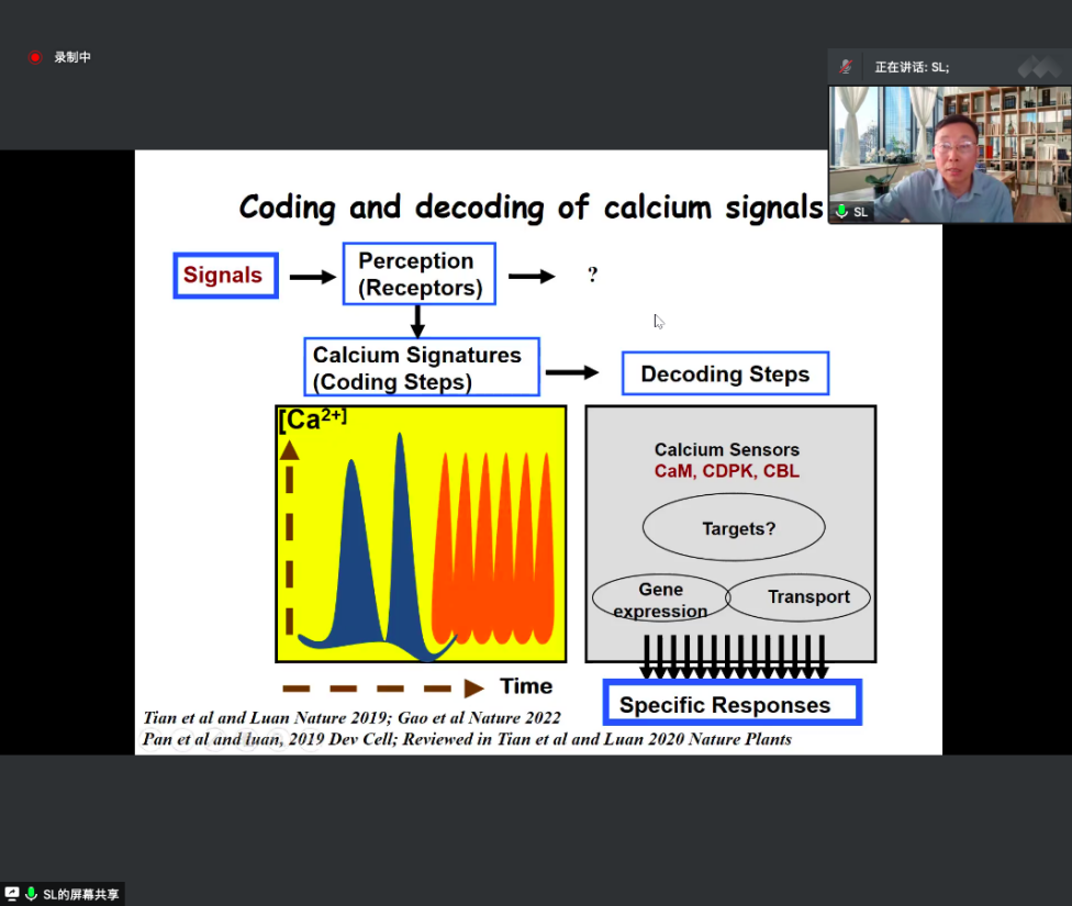 上午的研讨会由林辰涛老师主持。首先由王志勇老师为大家讲述糖和植物激素对植物生长发育的调控,主要介绍了负责蛋白糖基化修饰的SPY和SEC所介导的GA和BR信号转导机制及其对植物生长发育的影响。此外王老师也列举了研究中鉴定到的大量SPY和SEC的互作蛋白,涉及了根的发育、昼夜节律、开花、植物免疫等多个方面,也包括植物激素、环境信号等多种内外界信号途径的因子,暗示了糖信号以及糖基转移酶SPY和SEC对植物生长发育的重要调控作用,也为其他学者提供了丰富的研究线索。接着栾升老师介绍了第二信使Ca2+对植物营养吸收的调控,重点介绍了Ca2+受体CBLs和CIPKs的差异性互作对于植物钾吸收的特异性调控。乔红老师讲述了乙烯信号转导的表观调控机制,介绍了以EIN2、EIN3为核心的ENAP1及SRT1和SRT2参与的组蛋白乙酰化和去乙酰化过程,也发现了一个新的转录抑制因子Tree1,阐明了乙烯响应中转录激活和转录抑制的机制。董娟老师接着前期课程中的强烈安利,介绍了她们课题组的最新进展,除蛋白磷酸酶BSL1时空特异的极性聚集于细胞膜上从而调节气孔细胞命运转变外,也发现不同亚细胞定位的蛋白磷酸酶BSL家族通过去磷酸化不同的MAPK信号级联途经组分,最终差异性地调控SPEH蛋白稳定性从而影响气孔形成的机制。最后钟上威老师介绍了phyB区分光照和温度这两个重要环境因子的机制,发现光照和温度可以影响phyB相分离的形成和解离,phyB感知光照时依赖于构象的变化解除N端对C端的抑制从而通过C端寡聚化驱动相分离,而温度的感知不依赖于构象变化,通过NTE结构域直接感知温度变化并动态调控phyB的相分离从而实现温度感知。