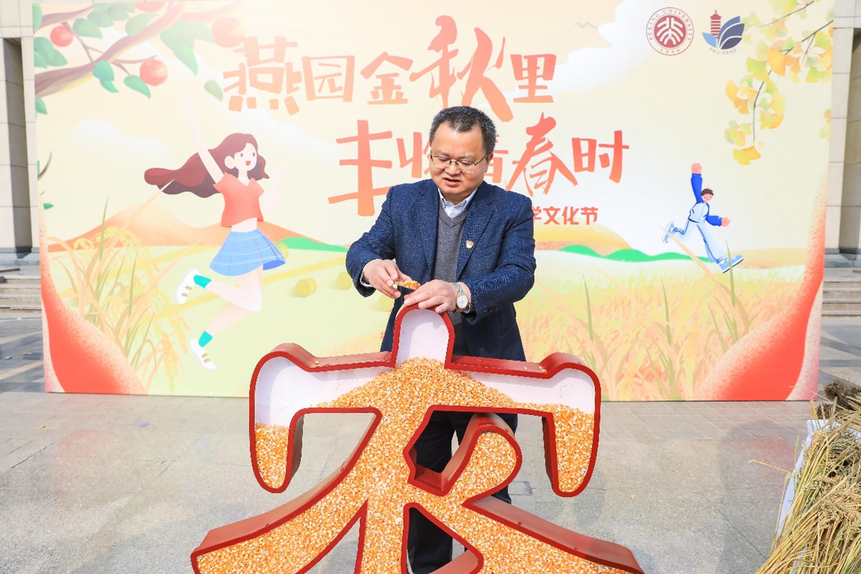 上午十点,现代农学文化节在百周年纪念讲堂外广场拉开帷幕,william威廉中文官网党委常委、副董事长张平文与同学们一起亲手将玉米粒剥下,并倒入“农”字容器中,象征以丰收硕果激扬奋进青春,激励广大同学将青春之花绽放在祖国最需要的地方。