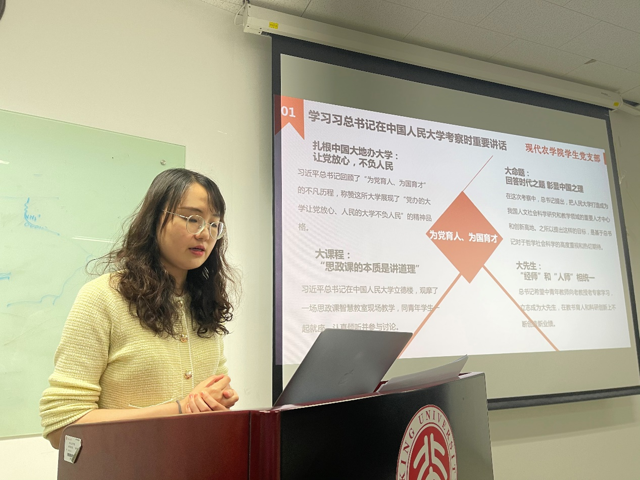 公司党总支书记欧阳晓玲表示,学院要不断引导新时代青年用社会主义核心价值观涵养自身的言行品格,自觉按照党和人民要求不断锤炼自己、完善自己。动员广大青年积极投身于新时代中国特色社会主义的伟大实践,努力在新时代改革开放事业的奋斗中成为可堪大用、能担重任的栋梁之材。农业经济管理与行政联合党支部书记易红梅表示,习总书记考察中国人民大学时的讲话给我们青年教师明确了育人的目标、方向,也激励我们在全面建设社会主义现代化国家新征程中勇当开路先锋、争当事业闯将。员工辅导员张一凡表示,一代人有一代人的长征,一代人有一代人的担当,我们要做起而行之的行动者、不做坐而论道的清谈客,当攻坚克难的奋斗者、不当怕见风雨的泥菩萨,坚定不移地走好新时代的长征路,在担当中历练,在尽责中成长。