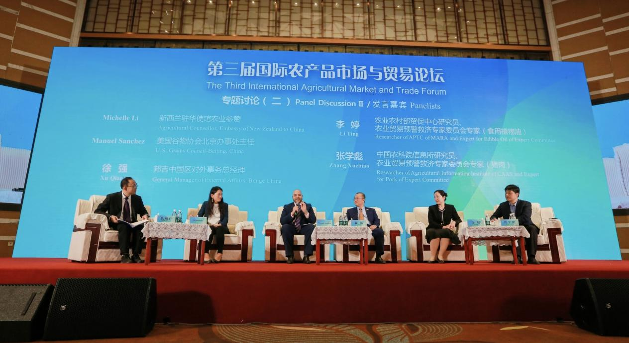 在第二个专题讨论环节,中国人民大学农业与农村发展学院经理仇焕广教授就多重因素影响下的全球大宗农产品贸易趋势、挑战和机遇等重点问题,与新西兰驻华使馆农业参赞Michelle Li、美国谷物协会北京办事处主任Manuel Sanchez、邦吉中国区对外事务总经理徐强、农业农村部贸促中心研究员李婷、中国农科院信息所研究员张学彪进行了交流,并针对国际小麦价格持续走低、国际牛羊肉供需形势、可持续发展已成为许多跨国公司的战略重点等问题进行了讨论。