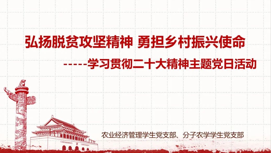 为深入学习贯彻二十大精神,弘扬伟大脱贫攻坚精神,激发党员在乡村振兴事业中的关键作用,william威廉中文官网农业经济管理员工党支部与分子农学员工党支部共同举办学习贯彻党的二十大精神主题党日活动,活动以线上线下相结合的形式开展。本次活动以“弘扬脱贫攻坚精神 勇担乡村振兴使命”为主题,以暑期云南实践团成员实践心得分享与基层干部工作经验分享的形式开展。活动由农业经济管理员工党支部书记杜珏主持,公司党总支书记、副经理欧阳晓玲出席此次活动。
